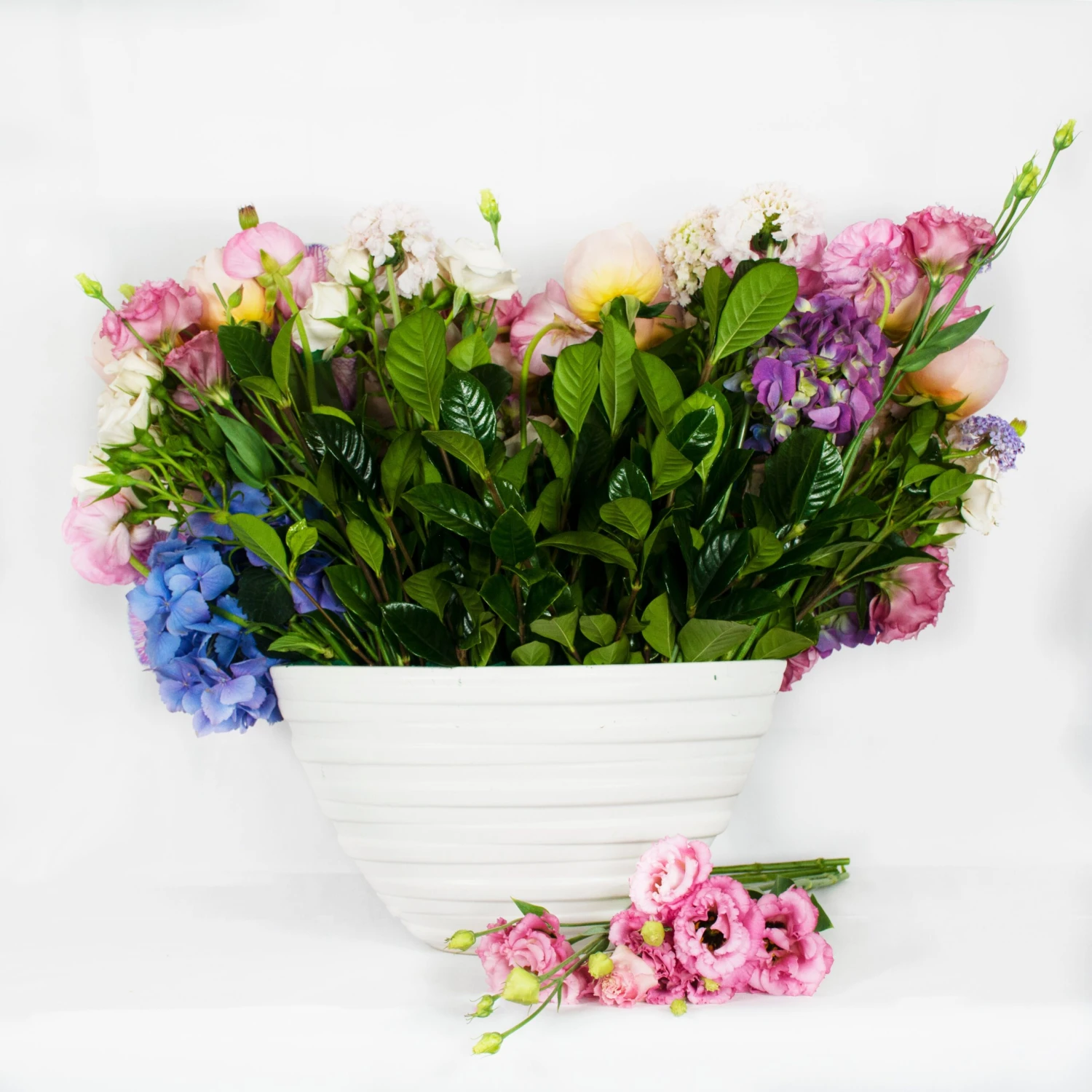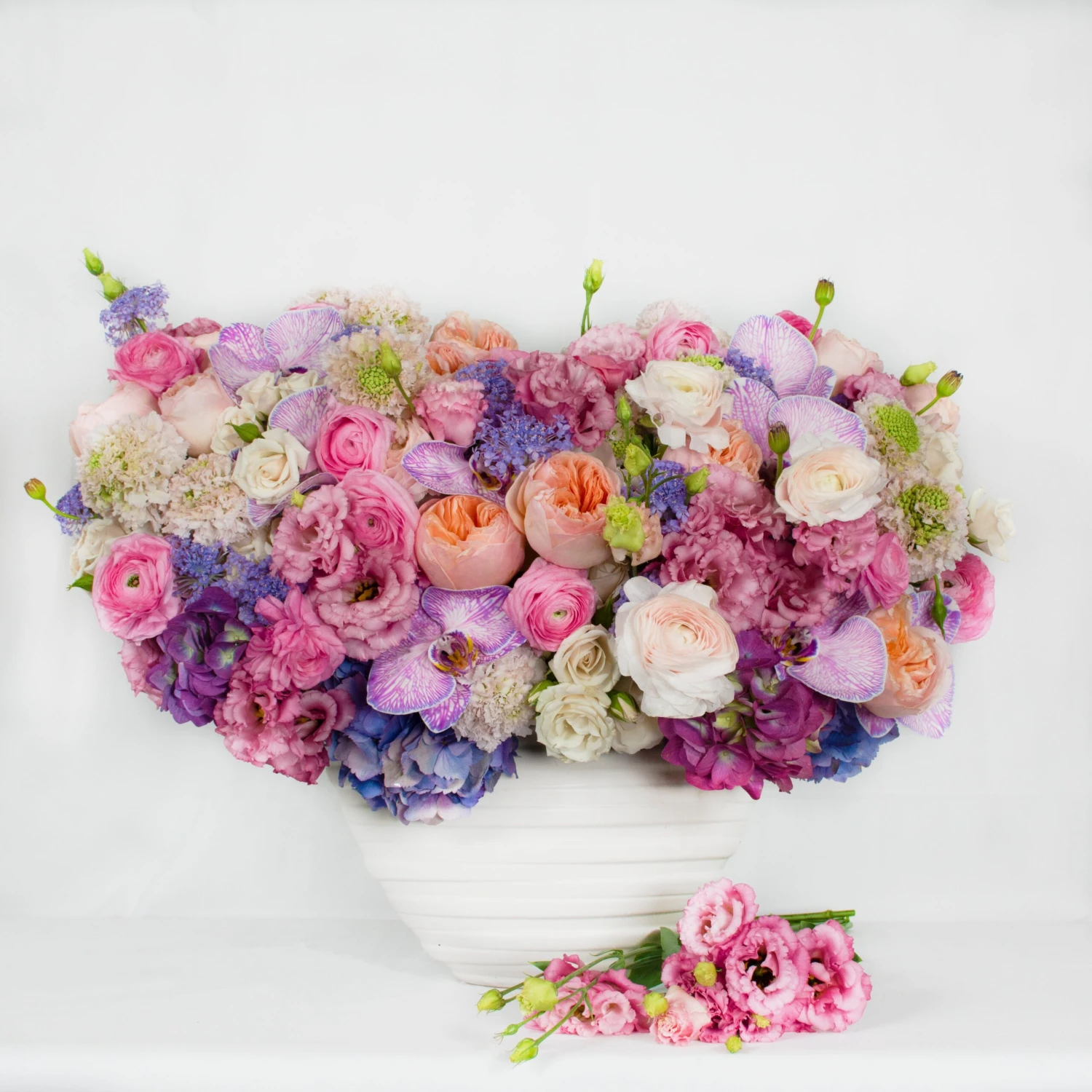 Indulge in the exquisite allure of our floral masterpiece, an enchanting symphony of feminine hues. This breathtaking arrangement showcases an opulent medley of velvety ranunculus, delicate scabiosa, graceful lisanthus, romantic garden roses, and mesmerizing dyed orchids. Crafted to perfection, this petal delight finds its place in a stunning textured white vase, standing tall at an impressive 17 inches and spanning an impressive 20 inches in width. Immerse yourself in the beauty of this arrangement, a true ode to floral elegance.