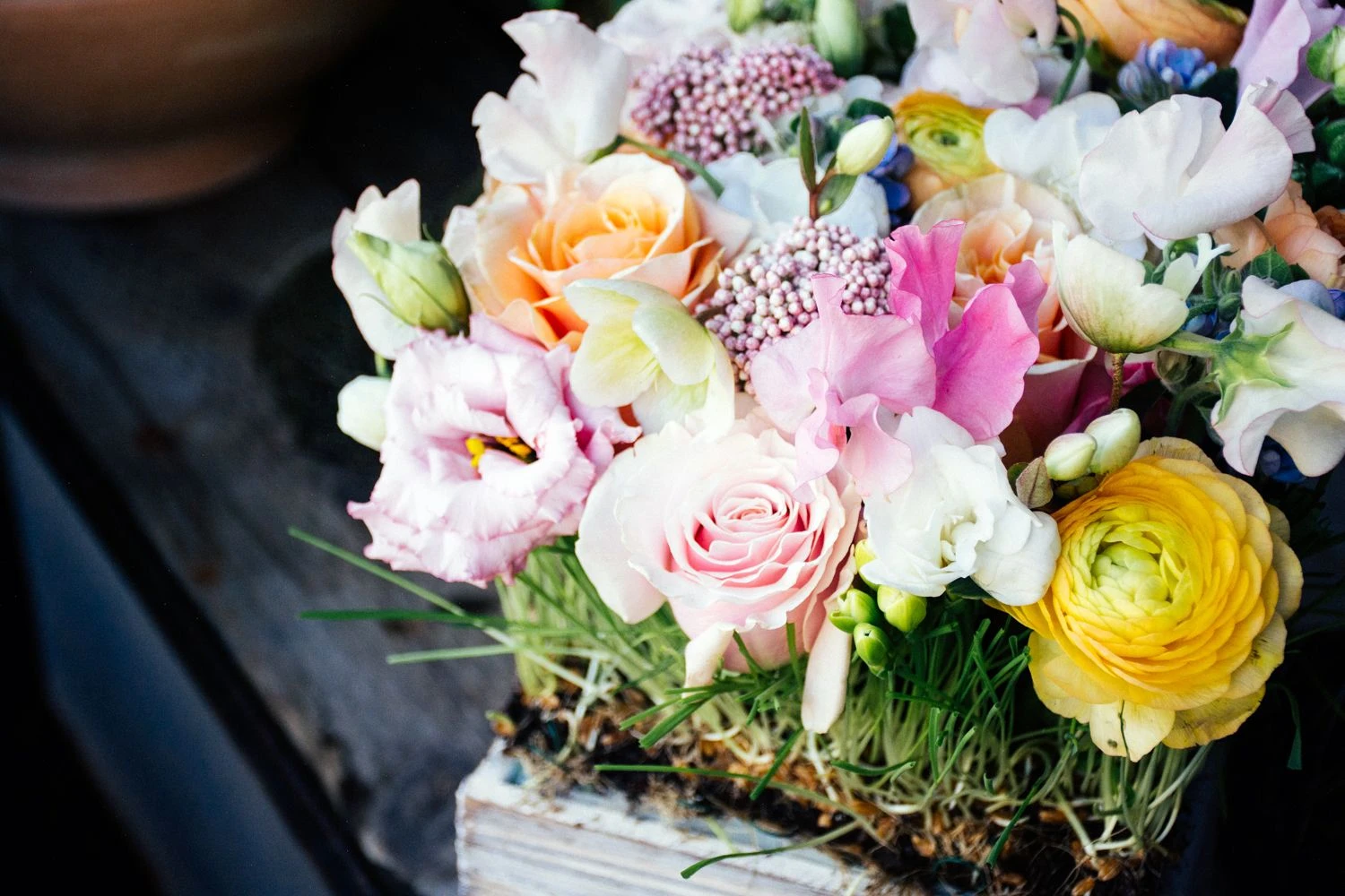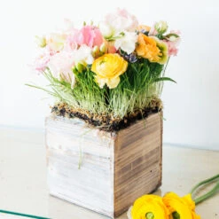 A petit jardin of your very own! This personal garden style design features the finest spring blooms atop a bed of fresh wheat grass. Sunshine yellow ranunculus, peach roses, pink rice flower, and a medley of sweet peas help you welcome the new season with open arms. This design rests atop a 6″ x 6″ wooden box.