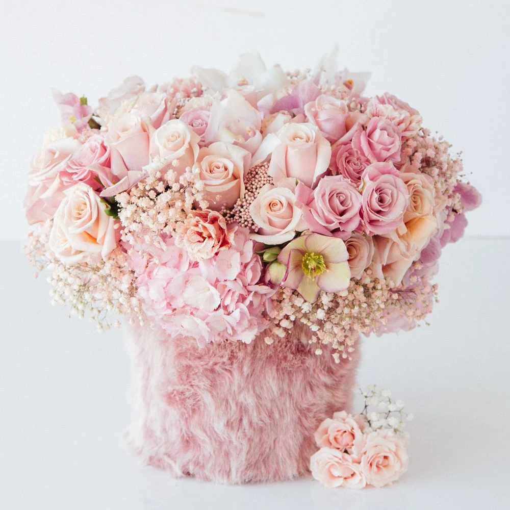Blush roses and cymbidium blooms are complimented by the baby’s breath and hydrangea placed throughout. Lisianthus and winter roses are placed throughout, with rice flowers adding the final touch. Resting inside an 7” tall pink fur-lined vase, overall this arrangement stands around 15” tall.