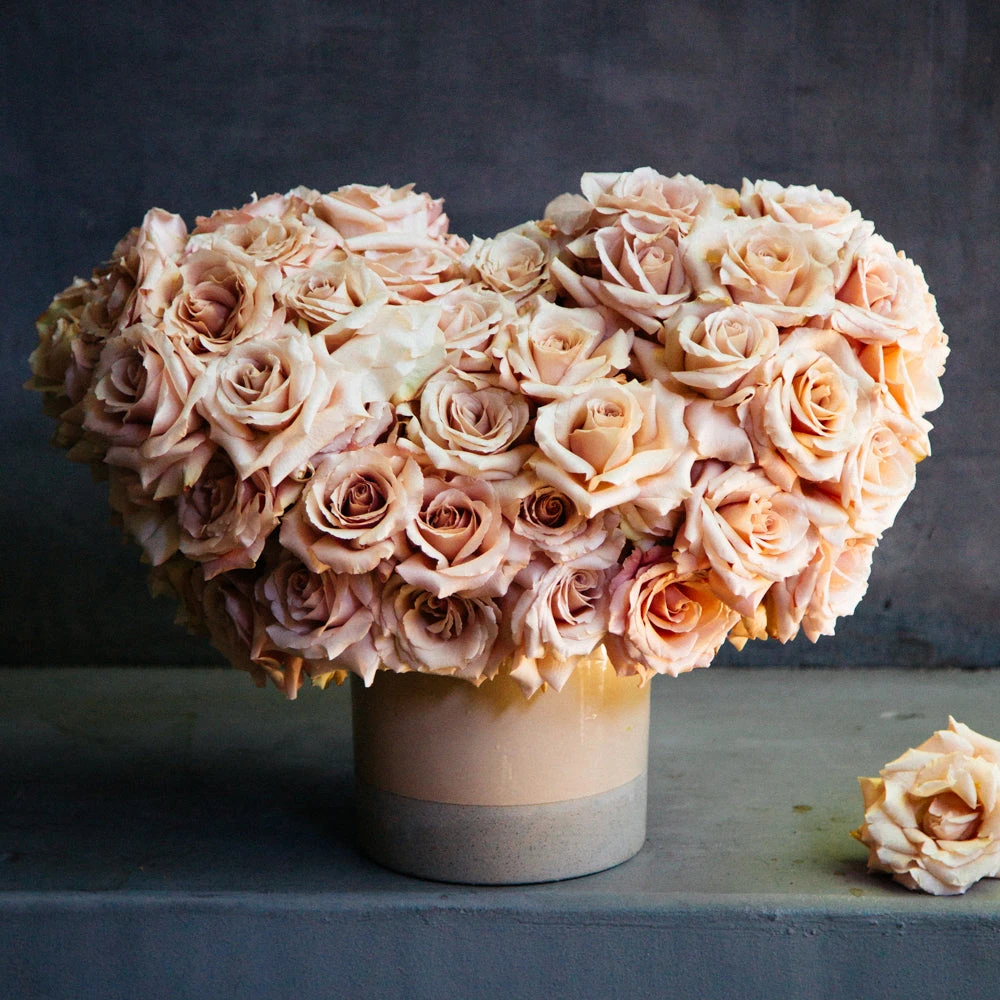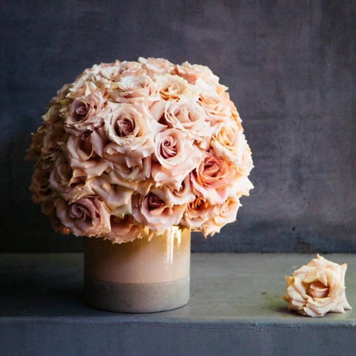 A flirty arrangement of up to 60 quicksand roses that will fill your home with a sense of gentle, soft romance. This piece showcases a neutral color palette that’s both romantic and sophisticated. The dark cream petals are infused with a soft blush color reminiscent of pink clay. Perfect for those who seek elegance in every detail.Â