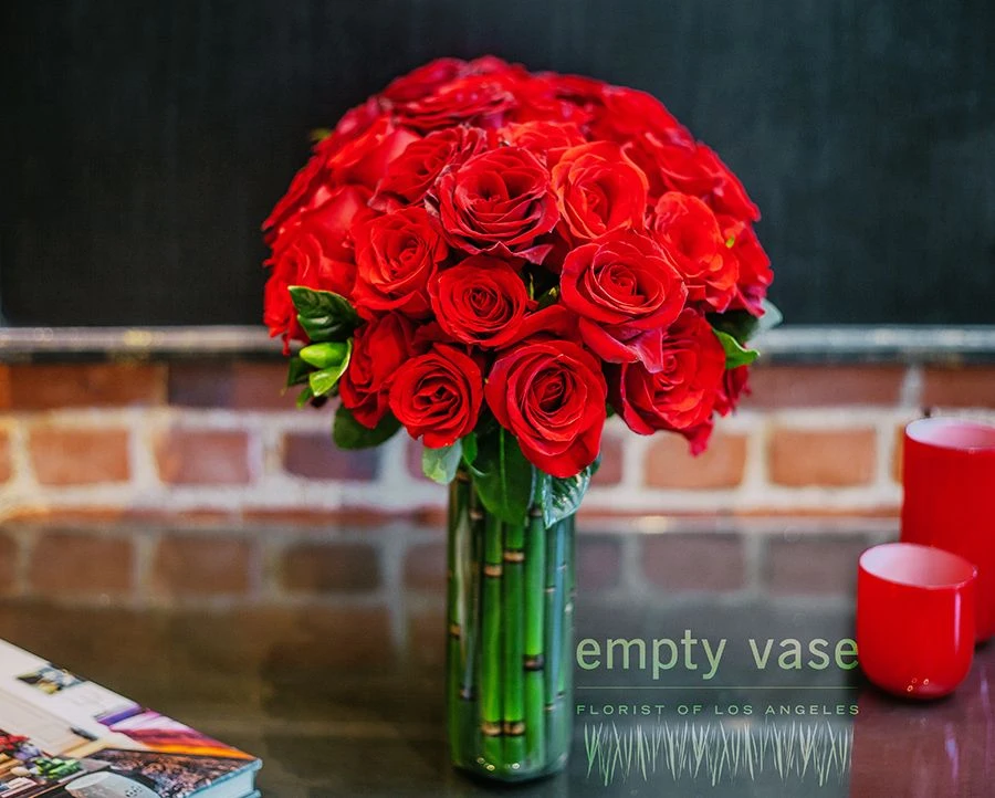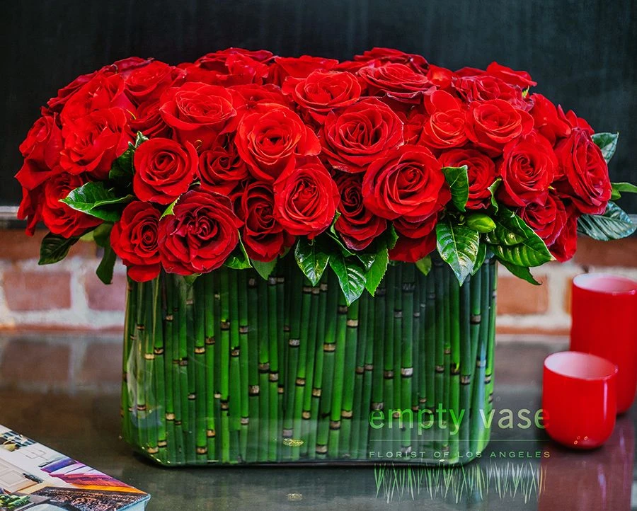 Perhaps one of the most renowned and heavily symbolic flowers, the red rose has long held a place in history. Whether the emblem of a royal family, or the expression of true love, the classic beauty of a red rose prevails. Here, our designers have chosen a minimalist styled design to showcase the splendor of up to 60 luscious roses. The arrangement rests in a contemporary flat rectangular vase lined with horsetail. This arrangement is approx. 22″ tall. Vase is approx. 12″ tall. This arrangement is available in different sizes upon request. Please call for all custom orders.