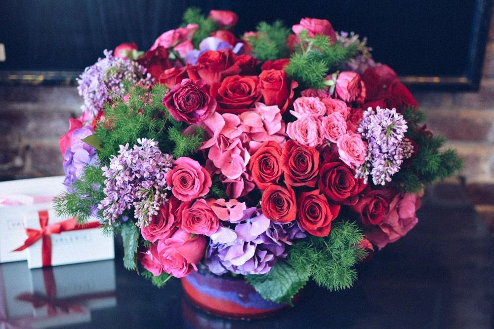 Bold and bright, this spectacular design is sure to steal your heart. Lilac and purple hydrangea provide a noble pop of color amongst lush pink roses, fuchsia ranunculus, and romantic red roses. Vibrant green ming fern provides a whimsical garden-style touch, while colored sand can be seen submerged within the 7″ by 7″ glass vase. Overall this arrangement stands at an impressive 23″ wide and 17″ tall.
