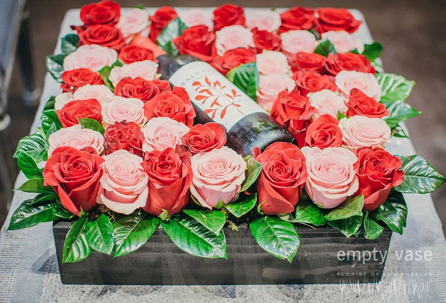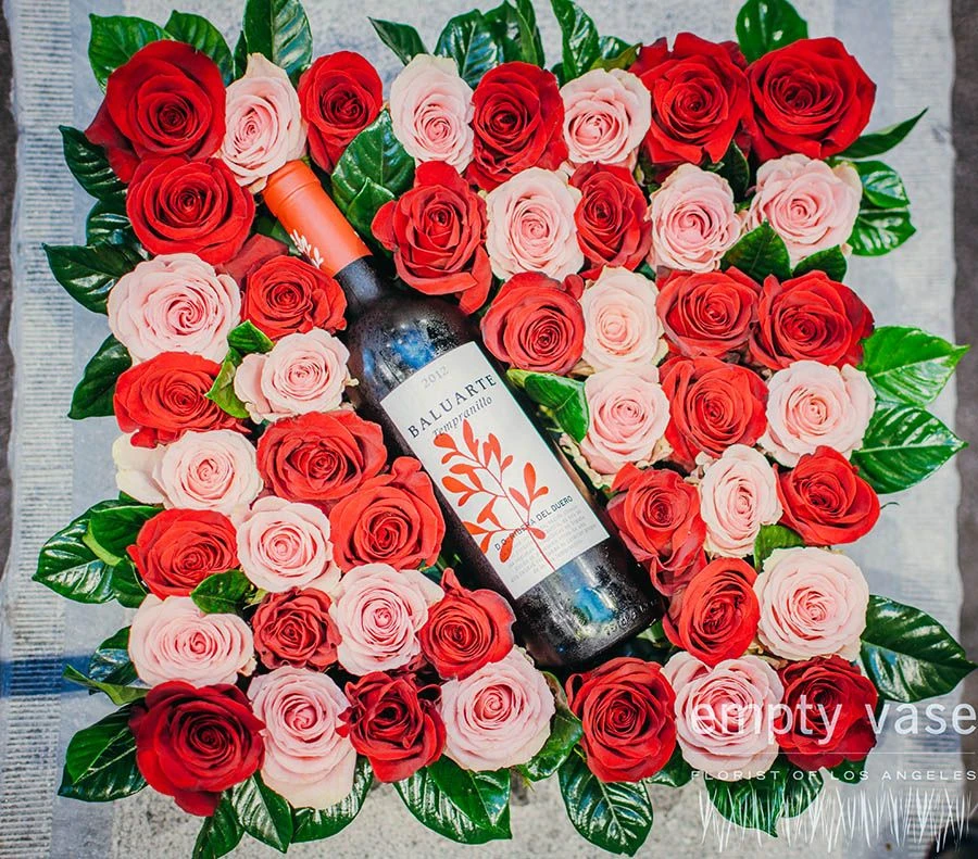 This romantic box contains a bottle of fine Baluarte Tempranillo wine carefully nestled upon a bed of gorgeous red and pink roses with vibrant green gardenia leaves, all contained within a 14”x14” elegant black wooden box.