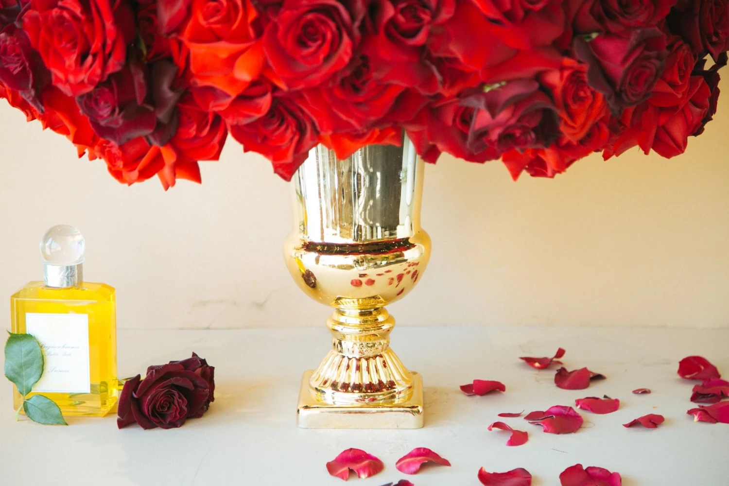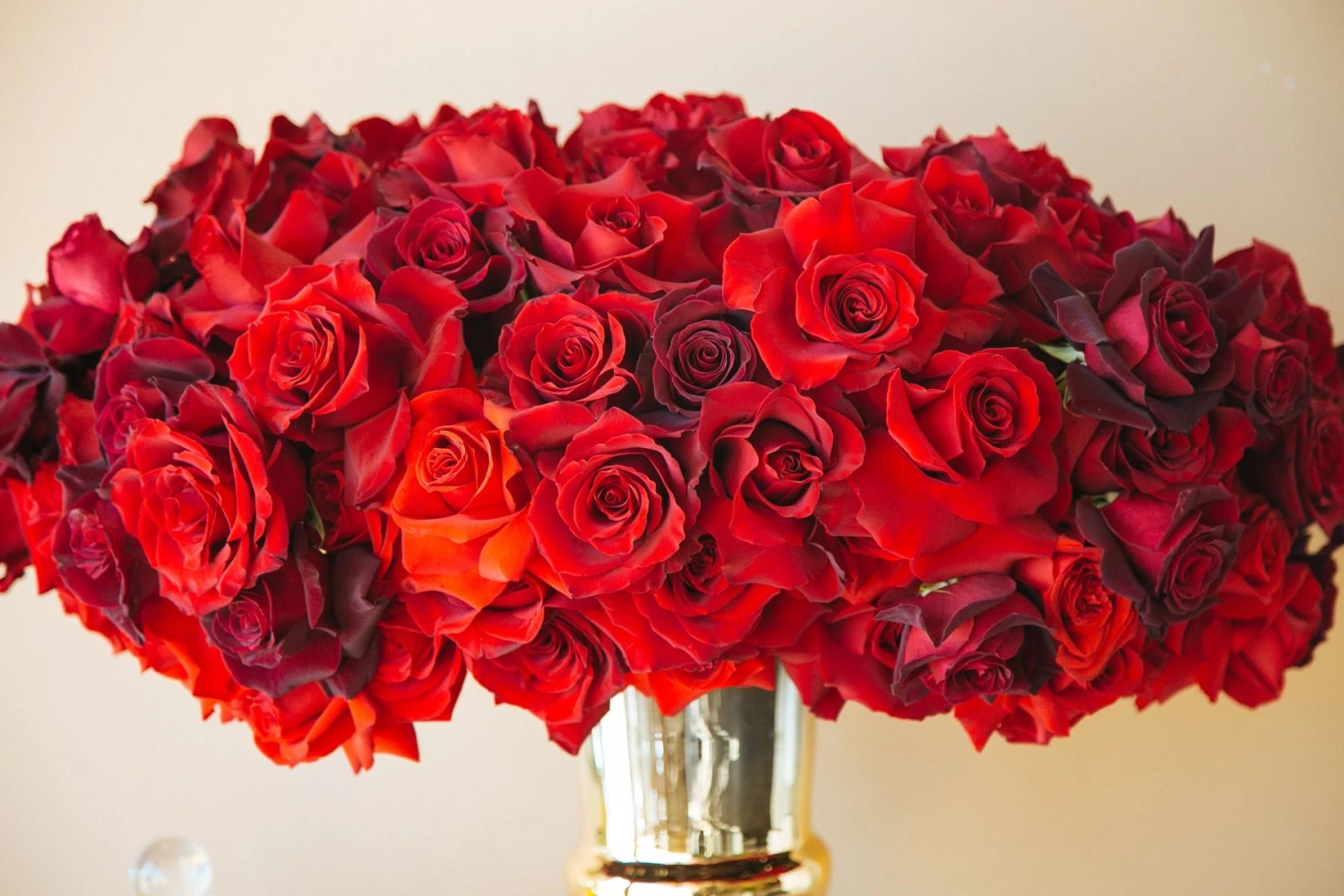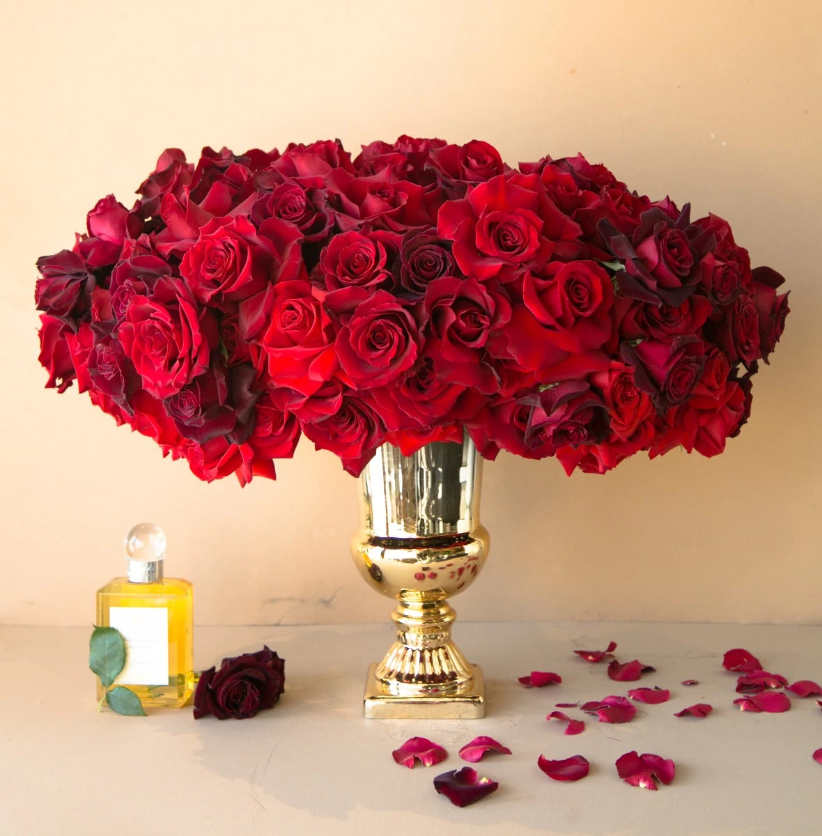 Take in the royal beauty of the red rose with this stunning floral arrangement. Up to 80 red roses in varient shades of red are gathered together, with large banana leaves providing the perfect accent. Resting inside of a 13″ tall gold vase, this arrangement stands at approximately 22″ tall and 27″ wide overall.