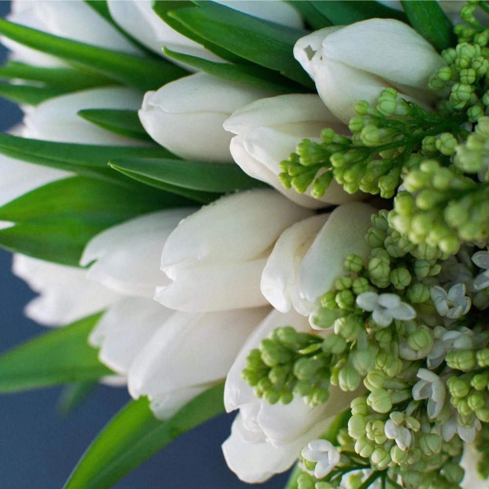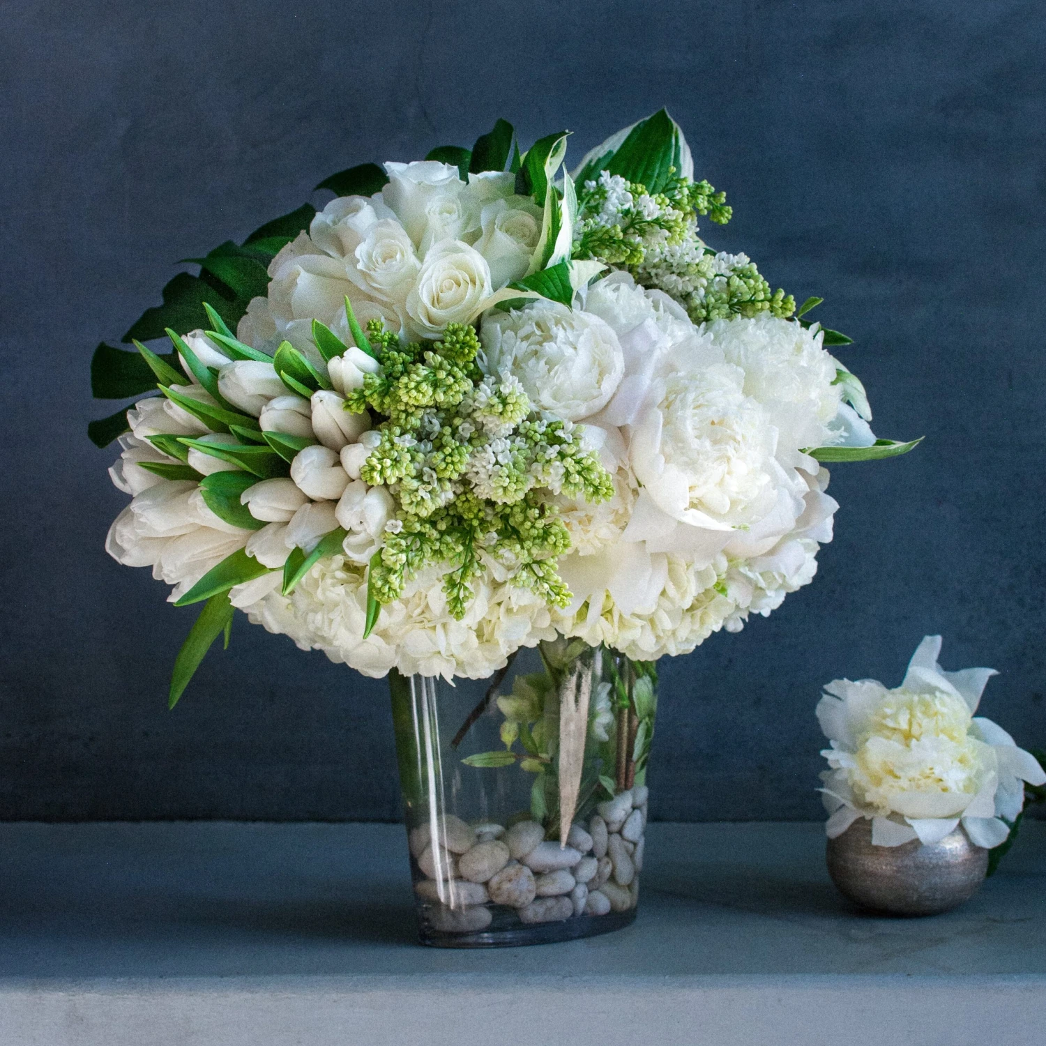 Drift away on elegant clouds of fluffy white peonies, crisp white tulips, and fragrant white roses. White hydrangea and white lilac create a look of lush abundance while monstera leaves and greenery submerged within the vase offer a fresh touch. This stunning design rests overflows from a 9.5″ tall by 8″ wide glass vase, and stands at approximately 18″ tall and 20″ wide overall.