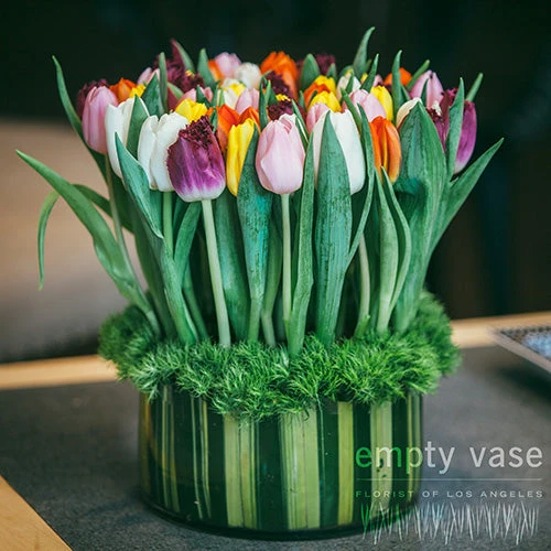 Welcome this dreamy tulip arrangement into your home. An elegant flower with ancient origins, the tulip has a longstanding connection with spring. Grown by the billions each year in Holland, it is not surprising that they were once symbolic of abundance. With their bright kaleidoscope of colors, these 50 darling tulips rest alongside dianthus in a glass vase lined with flax leaf.