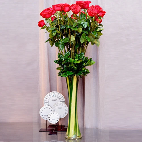 Renowned for their traditional beauty and splendor, red roses have a long-standing place in history as symbols of love, romance, and deep gratitude. This contemporary arrangement takes these vibrant blooms to new heights as they stand aloft in a soaring glass vase lined with contrasting greenery. This arrangement includes 24 roses and it is approx. 48″-50″ tall.