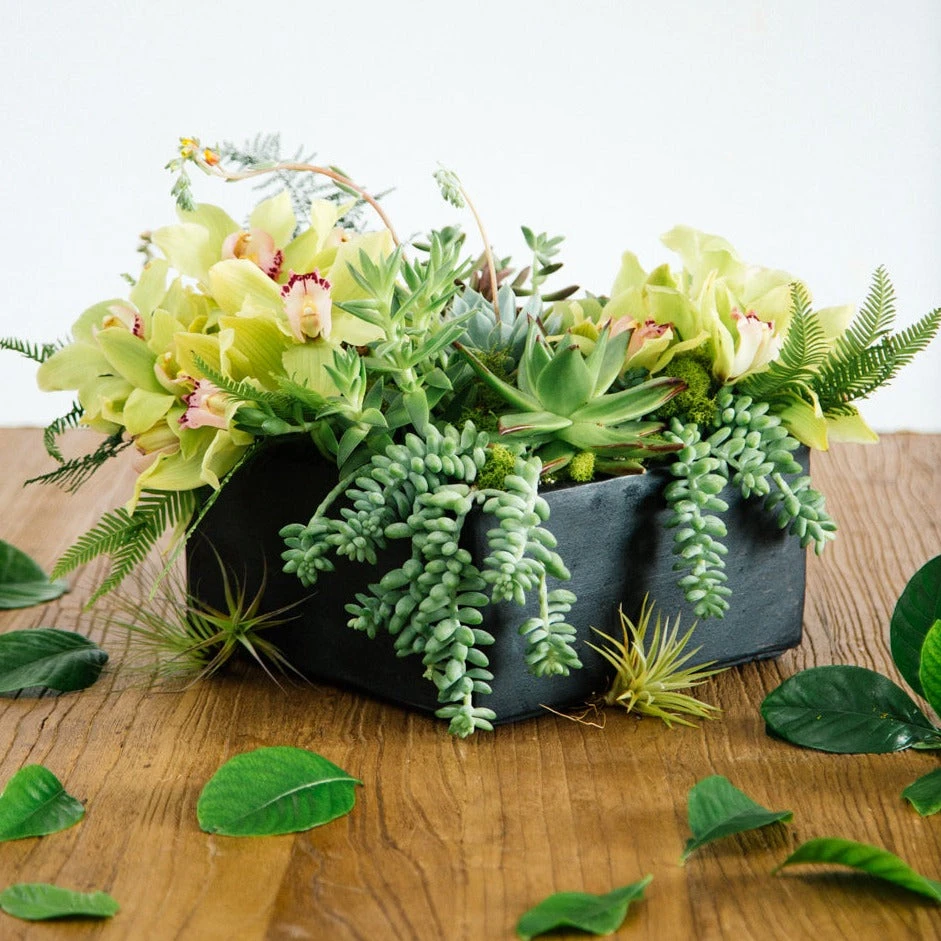 Lush green cymbidium orchids are accented by vibrant green reindeer moss and fern. Fresh green succulents add the final perfect touch. Resting inside a 5” by 10” black vase, overall this arrangement stands around 10” tall and 13” wide.