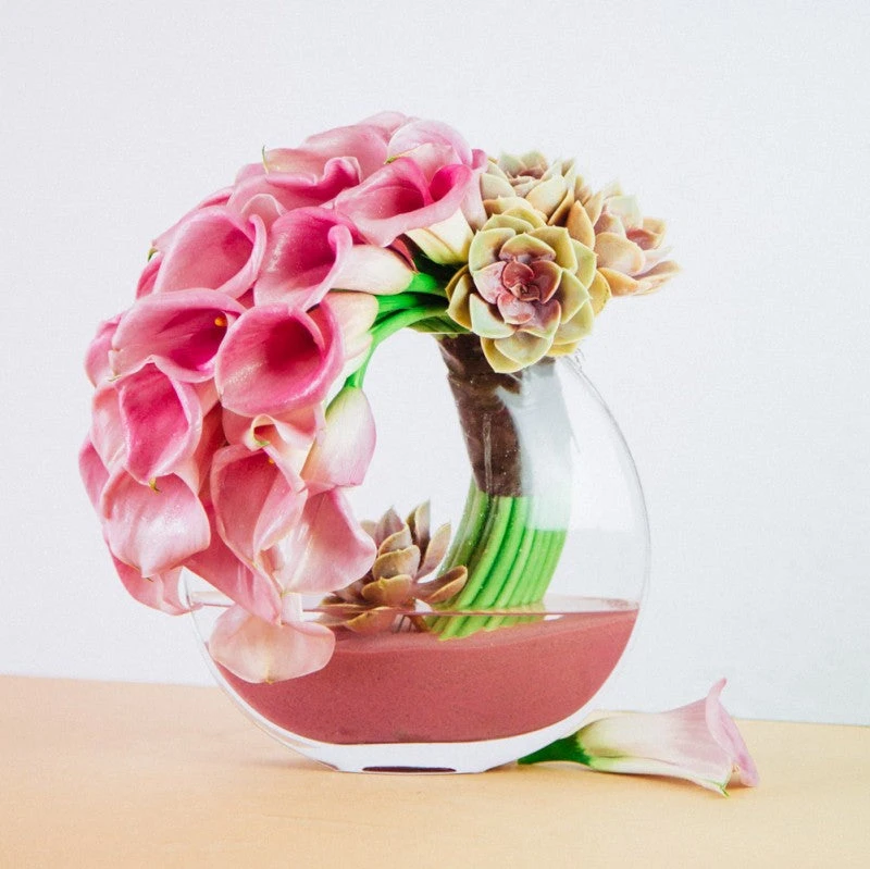 This elegant floral arrangement carries with it a lush and romantic design. 25 stunning pink calla lilies cascade to one side, as succulent blossoms rest on the opposite side. Stems have been wrapped in black tea leaf, and can be seen submerged inside blushing pink sand. Resting inside a skinny 9” by 10” glass fishbowl, this arrangement overall stands 13” tall.