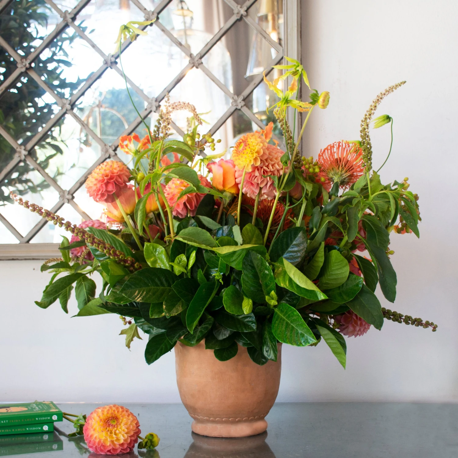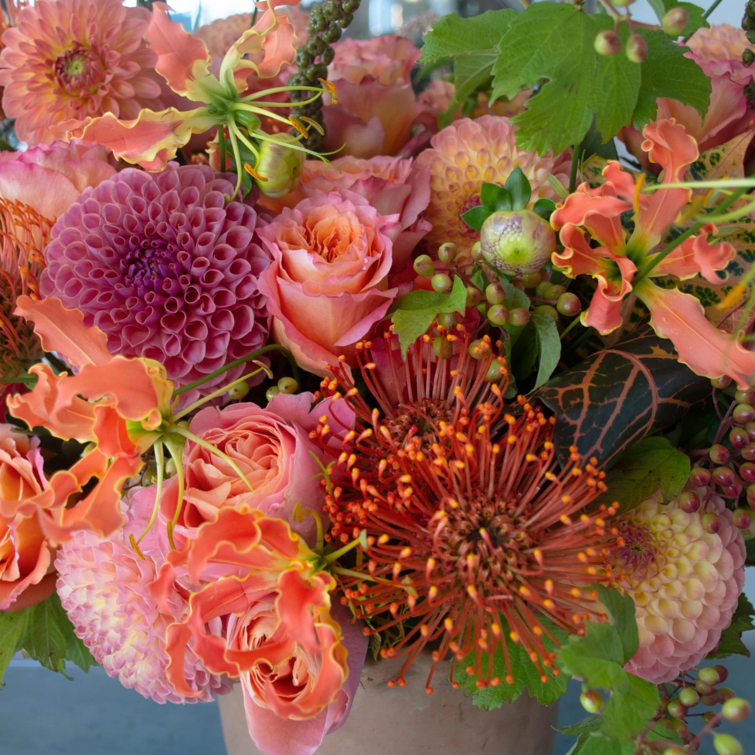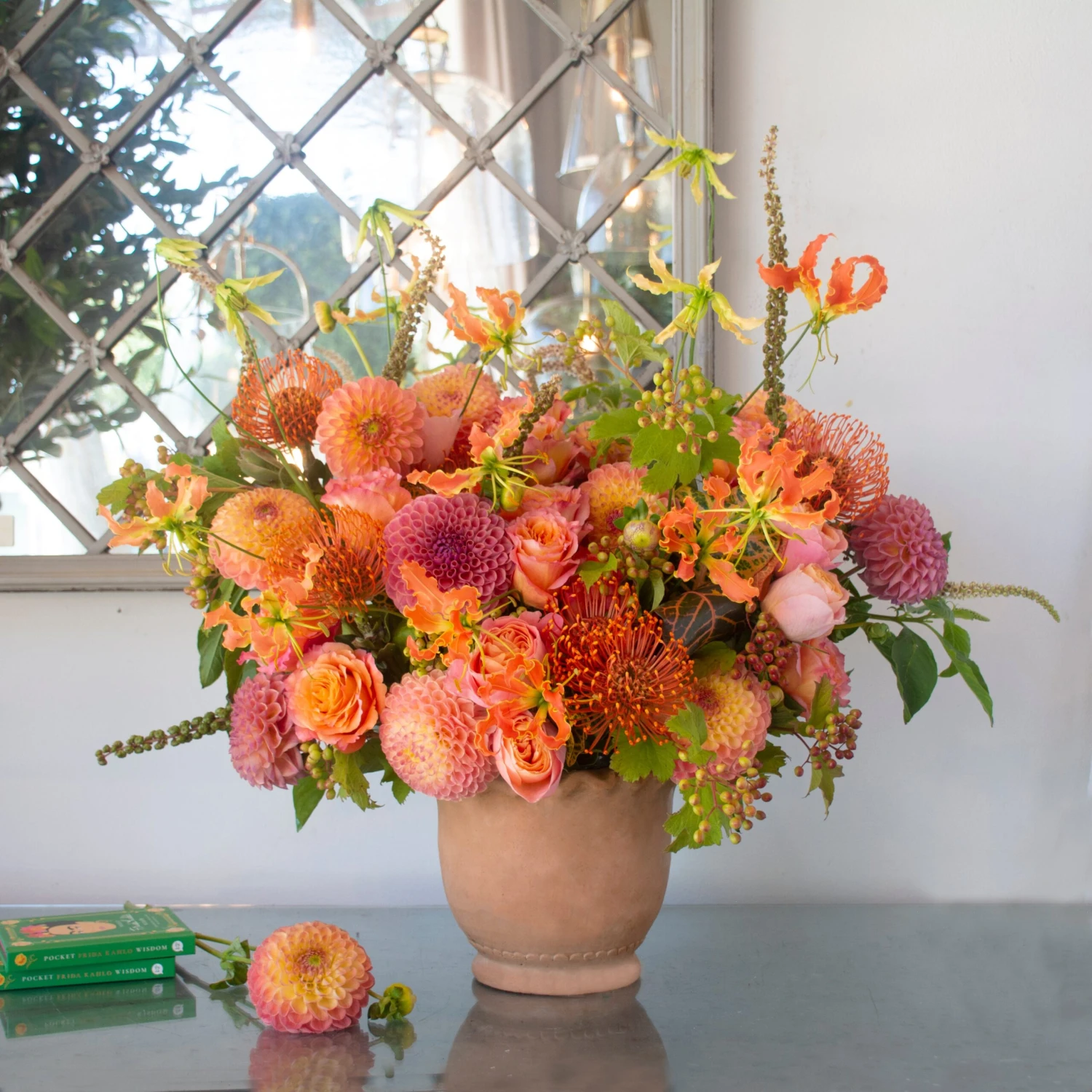 Experience the essence of the sun with our fiery orange blooms, including captivating two-toned dahlias and radiant pincushions. Witness the enchantment of sunset free spirit roses amidst the graceful presence of green and orange gloriosa flowers, elegantly swaying alongside pokey weed. Complete with a delightful touch of garden roses and African tea leaves, this meticulously crafted arrangement is a harmonious masterpiece. Adorned in a stunning terra cotta pot, it stands tall at 19 inches and spans 20 inches wide, promising to be a captivating centerpiece.