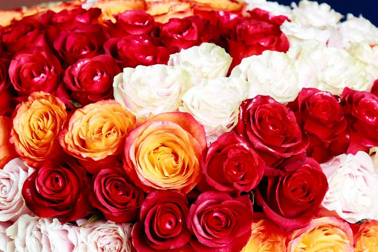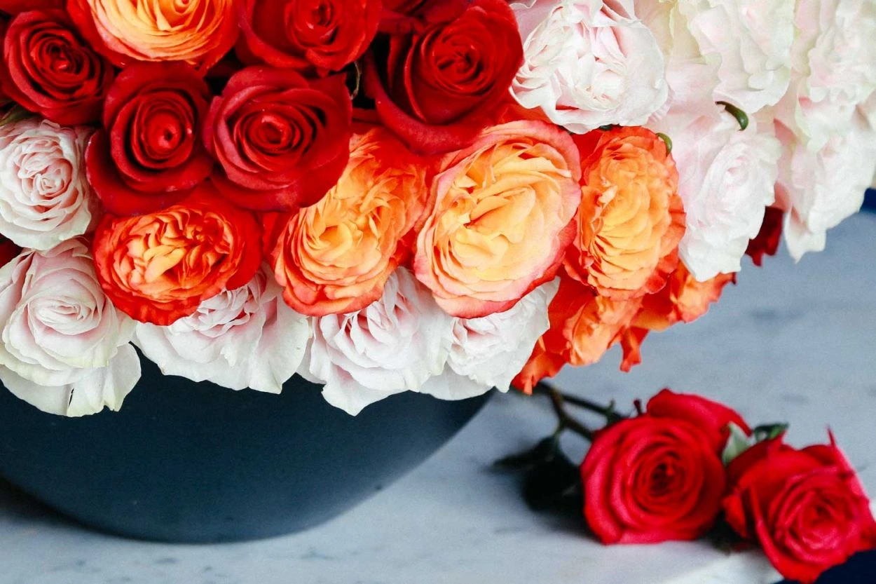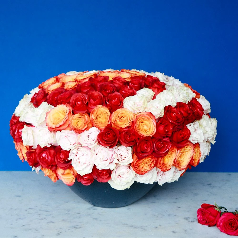 This fresh new floral design oozes Old Hollywood glamour. A breathtaking 200 roses in crisp chocolate red and sunshine yellow form a lush cloud atop an 8″ tall matte black designer vase. This arrangement stands at approximately 14″ tall overall.