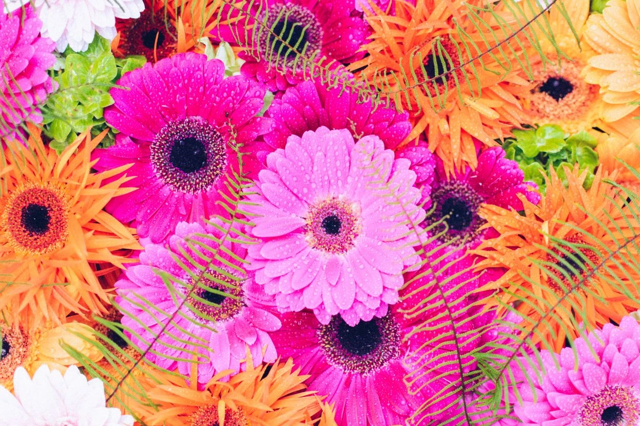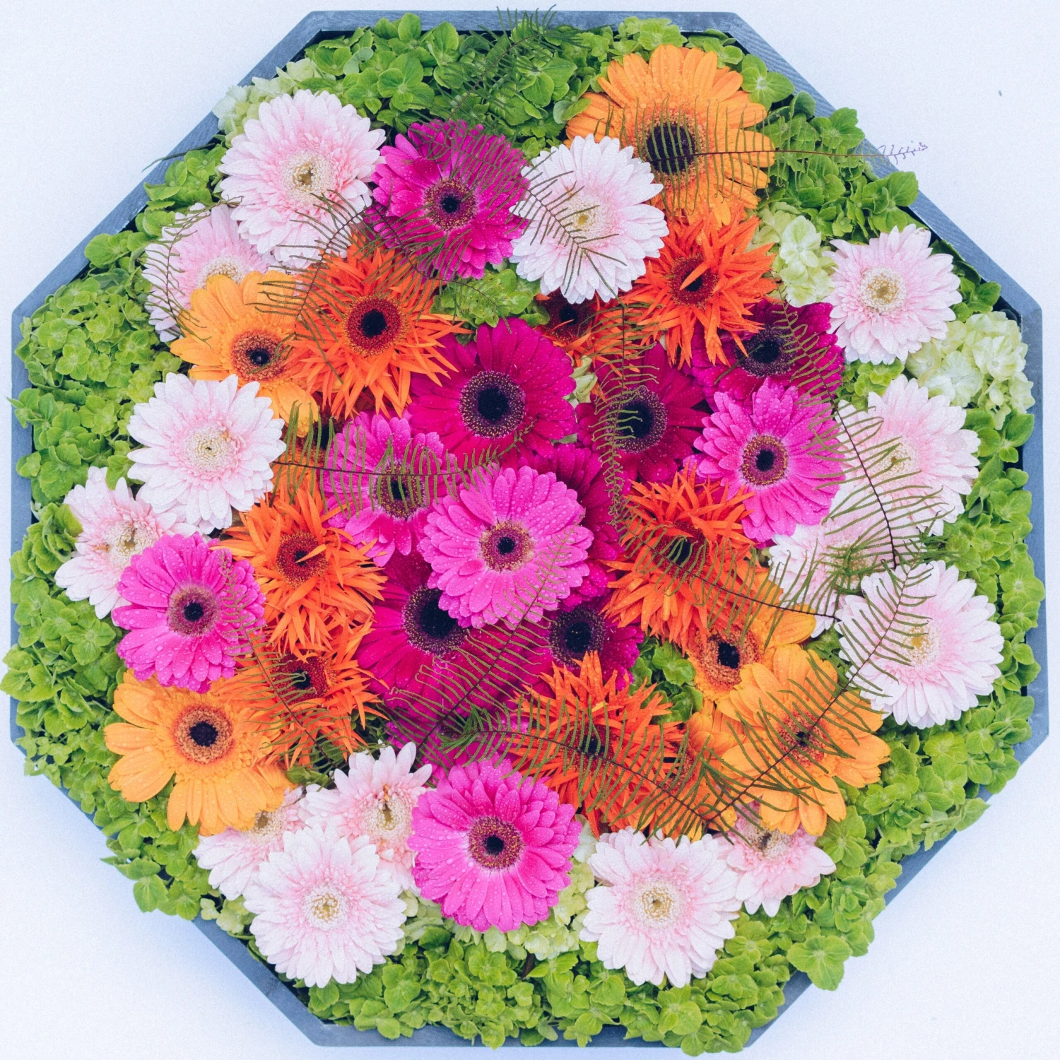 This delightfully cheerful private garden features over 40 vibrant gerbera daisies, whimsical fern, and lime green hydrangea. Resting within a 24″ wide grey octagonal wooden box, this fresh new design is sure to brighten their day.