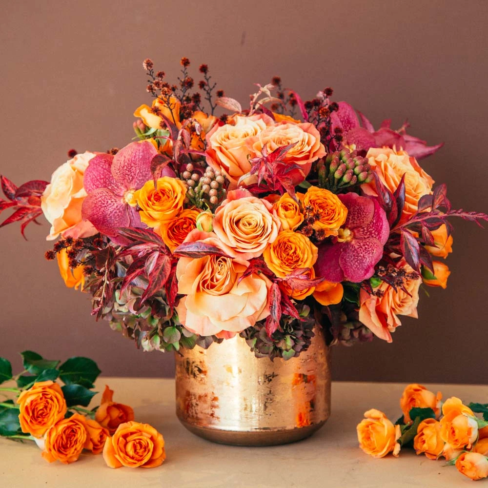 This magnificent floral arrangement is bursting with fall colors and exotic blooms. Delicate baby orange roses and spray roses are paired with red fall foliage and Vanda blooms. Dark green and brown hydrangea blooms can be seen at the base of the blooms, with accents of fall berries placed throughout. Resting inside a cylindrical 8” tall rose gold vase, overall this arrangement stands 15” tall.