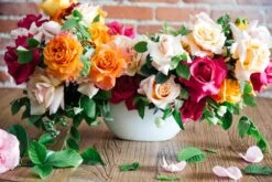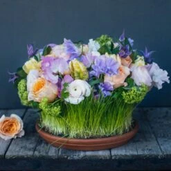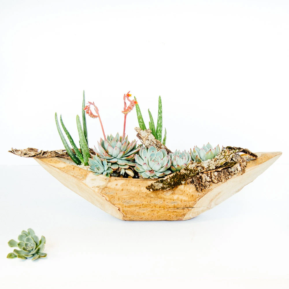 This beautiful arrangement carries a grounded and earthly essence. Succulents are delicately placed beside each other, with birch bark and stones filling the wooden boat container. This arrangement stands around 6” tall and 21” wide overall.