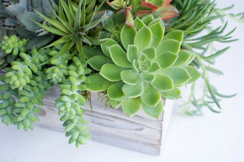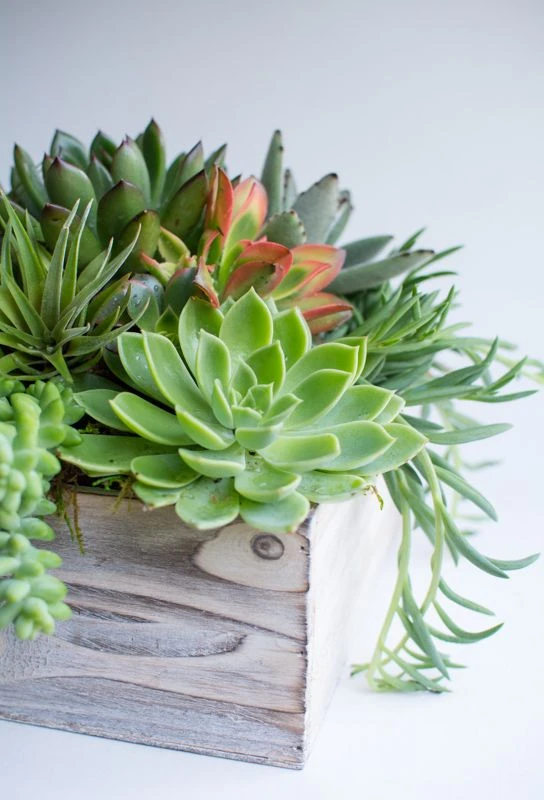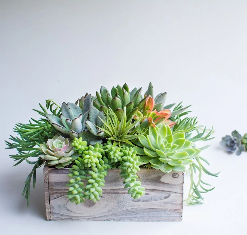 Answer the Call of the Wild with this vibrant, earthy design. A lush assortment of effervescently green, hand-selected succulents spill out from the white washed wooden box they rest in. The handcrafted box measures 5″ by 12″, and the arrangement stands at 10″ tall overall.