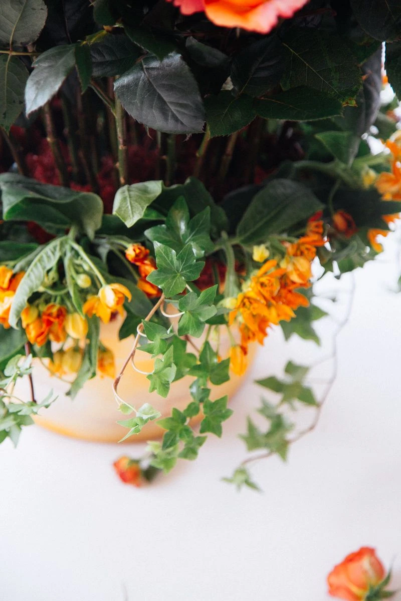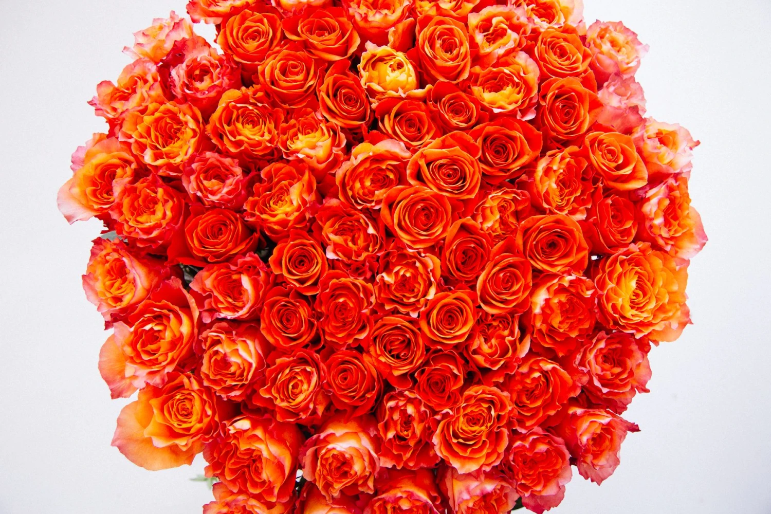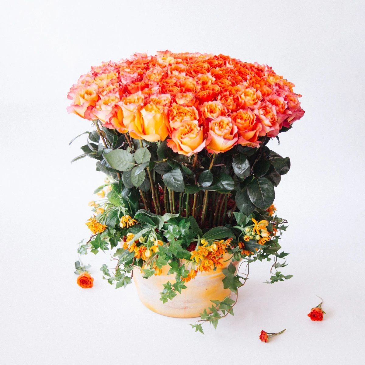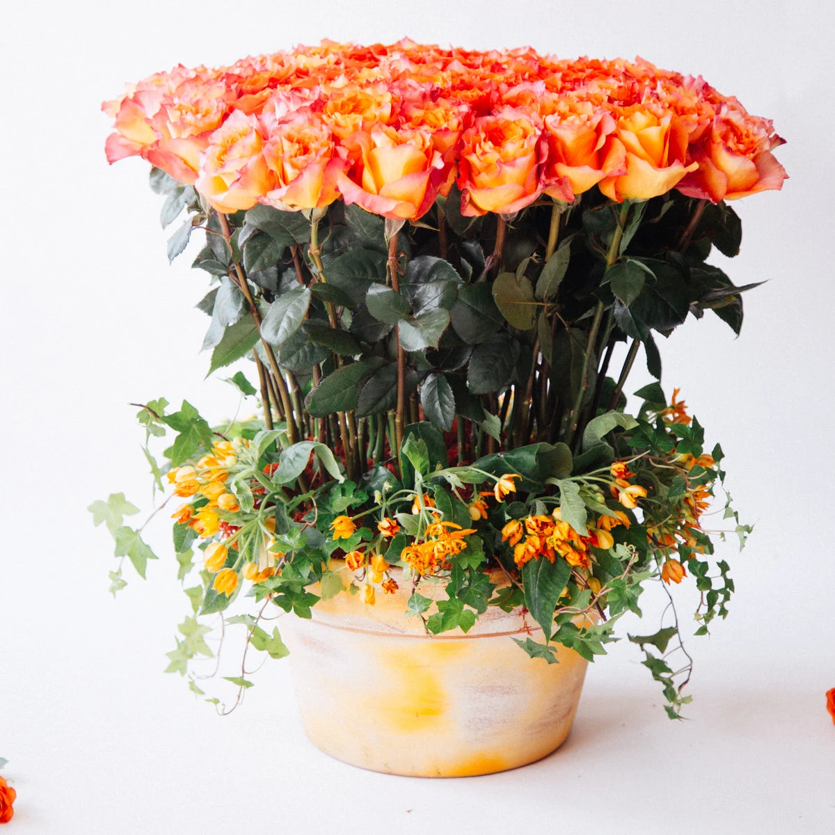 This incredibly stunning floral arrangement captures the true beauty of the rose. Up to 75 orange roses tower above a bed of orange asclepius, with ivy and reindeer moss accented throughout. Resting inside an 8โ by 9โ hand-painted orange ceramic pot, overall this arrangement stands around 16โ tall and 23โ wide.ย
