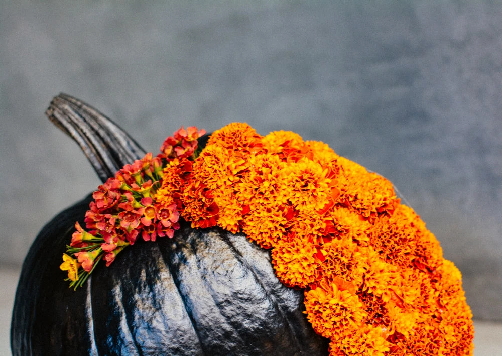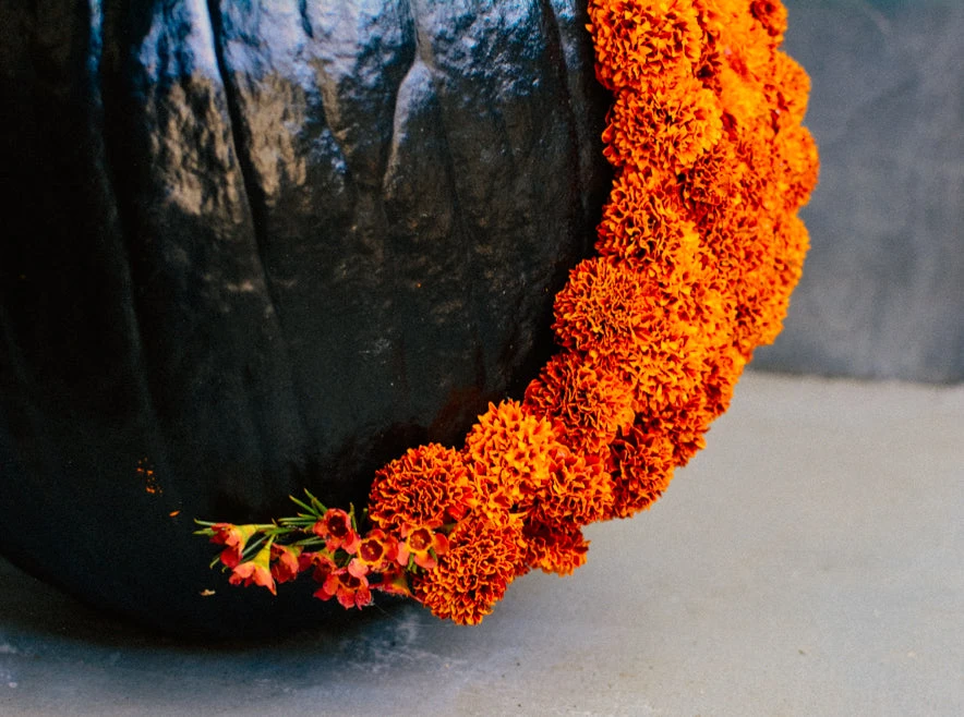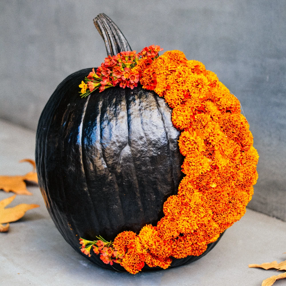 This bewitching seasonal pumpkin design will have you gazing at the bright crescent moon. Dressed in glossy black paint, this pumpkin sits ornately covered with vibrant orange carnations and wax flowers in a 3D moon design. This festive design stands at approximately 10″ tall overall, and may slightly vary in size per pumpkin.