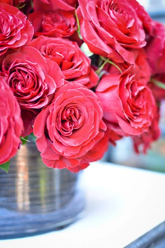 This enchanting design exudes romance and love. One hundred black pearl roses form a luxe pavé, a rose variety which features velvety soft petals and sheen like no other. Natural black midollino sticks line the interior of the 5″ by 12″ custom glass vase, and this arrangement stands at approximately 15″ tall and 25″ wide overall.