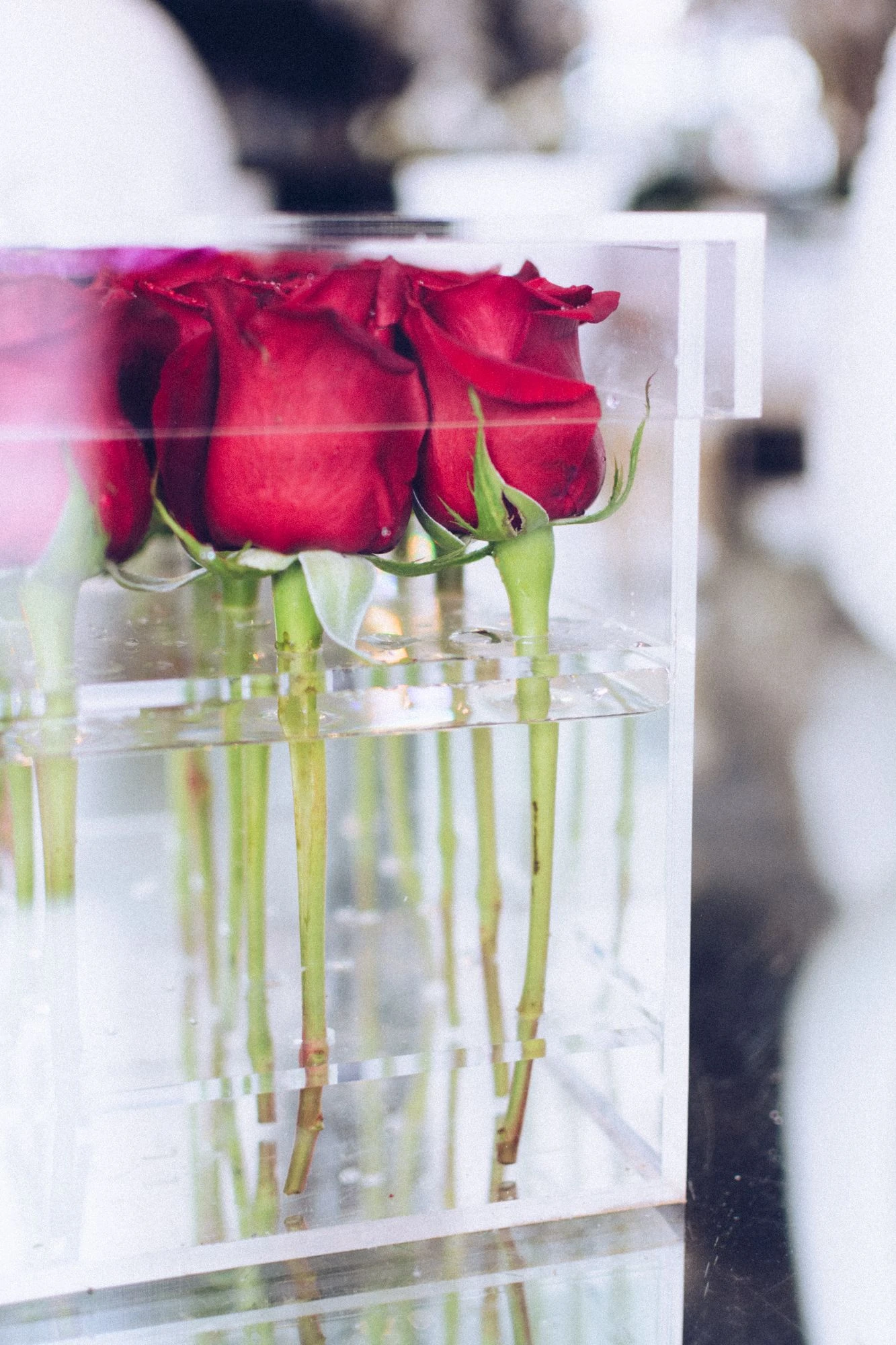 Modern and chic, this crystal clear acrylic flower box features 25 stunning red roses, all standing tall and held perfectly in place. A single purple vanda orchid delicately graces the top of the 10″ wide by 8″ tall design, which includes matching acrylic lid for perfect gifting.