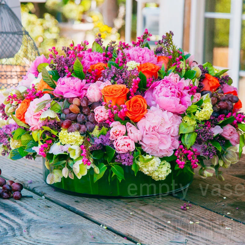 A piece of the old world and the beauty of a garden can both be seen in this ethereal floral arrangement. Soft pink hydrangea and tulips are paired with deeper pink peonies. Orange roses pop from throughout the arrangement, with lavender lilacs and fresh grapes placed throughout. Vibrant green viburnum, winter roses and gardenia leaves add the final touch of green, along with monstera leaves that line the 16” by 4” cylinder glass vase. This arrangement stands 12” tall and 31” wide overall.