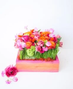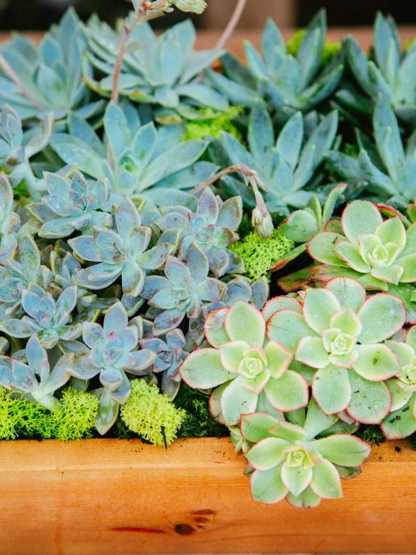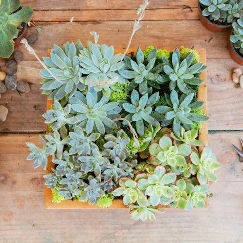 This stunning arrangement captures the essence of an untouched and unburdened jungle. A beautiful hand-selection of succulents is placed throughout, ranging from echeverias to aeoniums. Hand-painted reindeer moss in stunning shades of green rest beneath the succulents. This lush arrangement rests inside a 12” by 12” hand-crafted wooden box.