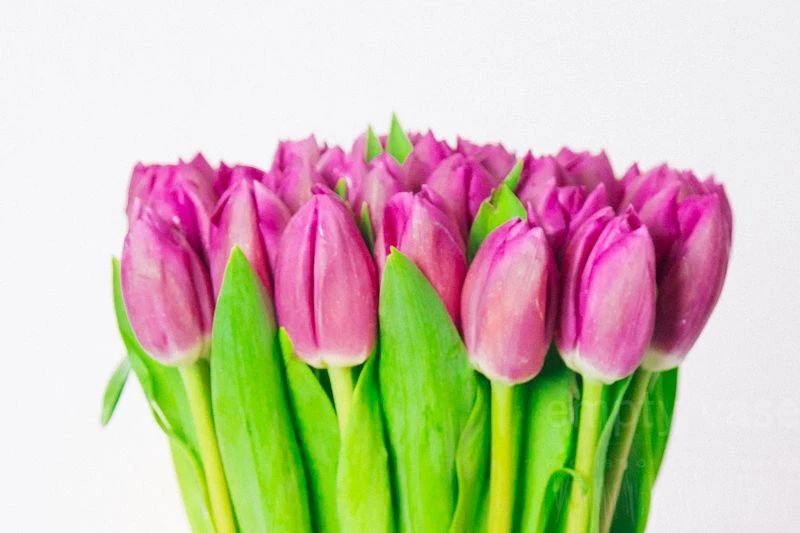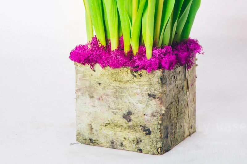 This stunning and vibrant arrangement is bursting with color. FORTY beautiful magenta color tulips grow towards the sky, with hand-painted magenta reindeer moss resting at the base of the Tulip stems. Resting inside a 5.5” by 5.5” glass vase, a final touch of Birchwood can be seen lining the exterior. This arrangement stands 13” tall and 7” wide overall.