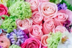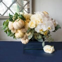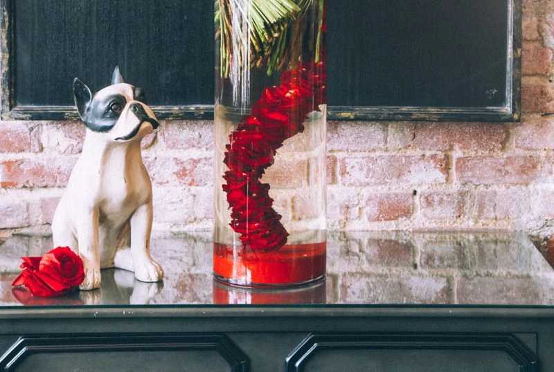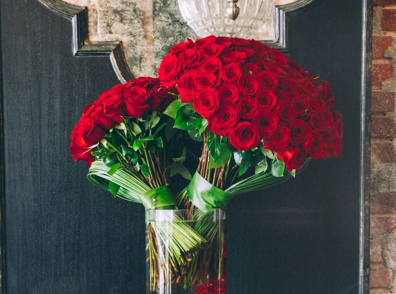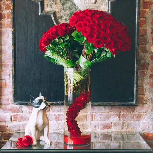 This lush floral arrangement captures the true essence and beauty of the red rose. One could say it carries a French tone with its modern choice of design. ONE HUNDRED-FIFTY RED ROSES are gathered together into two bouquets, wrapped with a single ti leaf, with steel grass looping to each side. Rose petals cascade towards the bottom, submerged within the 22” by 8” glass vase. Red sand rests at the bottom, with the overall arrangement standing 37” tall and 28” wide.