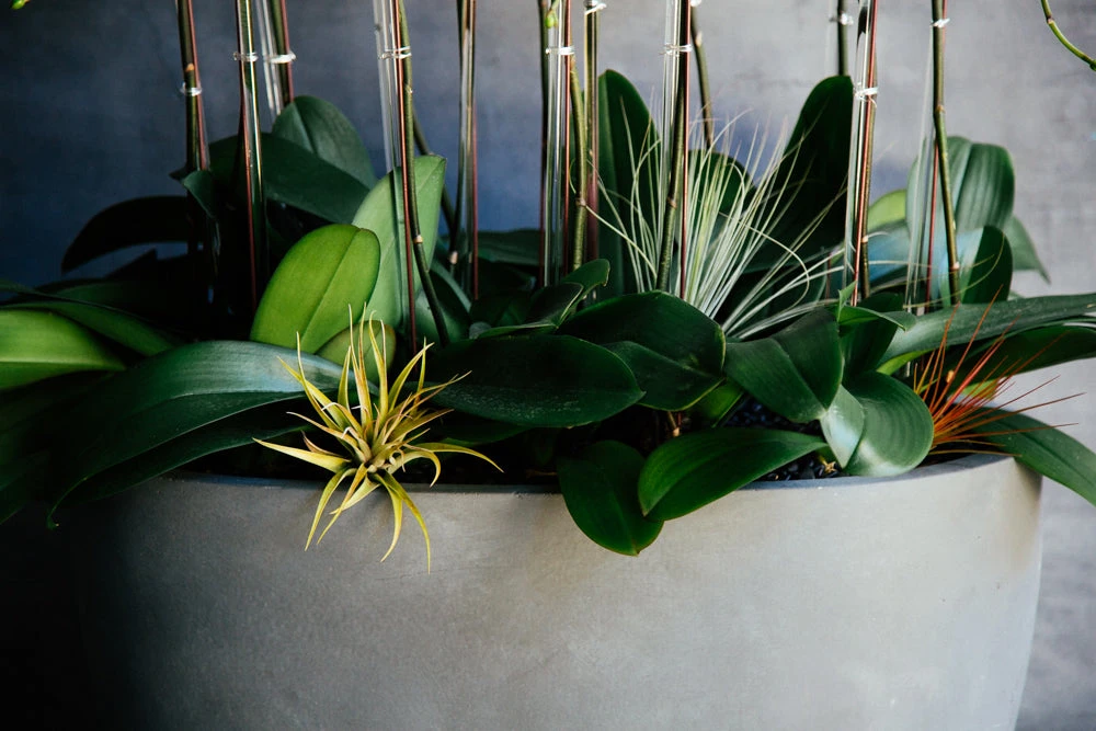 This grand and gorgeous orchid plant design will add a regal touch to any room. Up to 15 pristine white and purple phalaenopsis orchid stems tower over a bed of black river rocks. Resting inside a 15” by 26” grey ceramic vase, overall this arrangement stands around 40” tall and 42” wide.