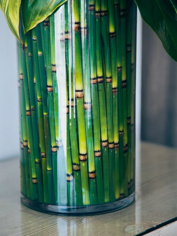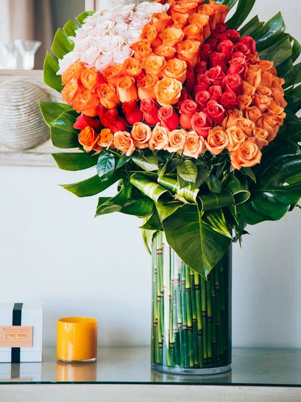 This gorgeous floral design stands as a signature look in itself. A flourish of ONE HUNDRED roses in shades of orange, red and pale pink are gathered together. A magnificent cascade of monstera and Ti leaves sit behind the blooms, as the backdrop. Horsetail lines the interior of the 15” by 7” glass vase. Overall this arrangement stands 40” tall and 31” inches wide.