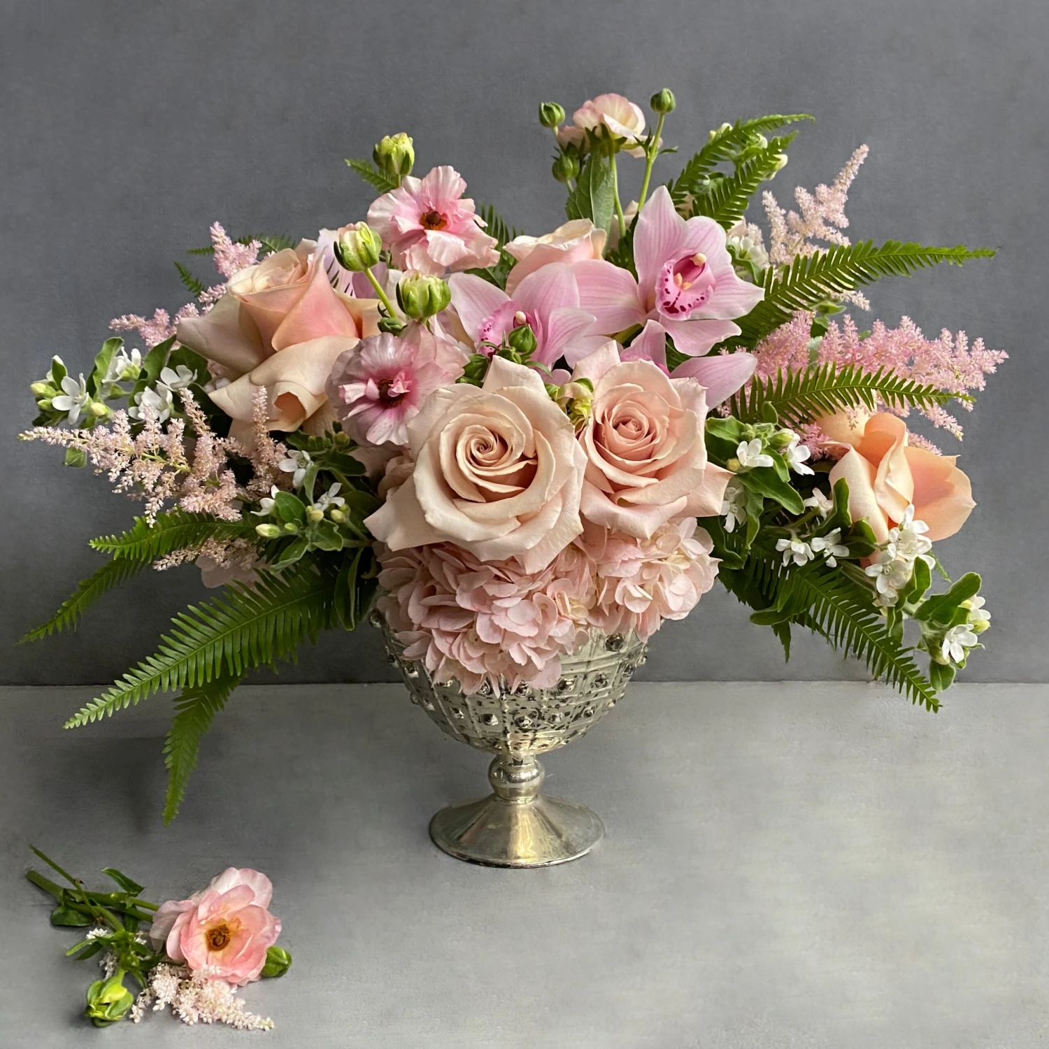 This luxurious arrangement embodies sophistication and charisma. Fluffy quicksand roses, butterfly ranunculus and cymbidium orchids meet astilbe, hydrangea and tweedia. Accents of umbrella fern contour this piece and contribute to its regal look. Perfect to decorate your home or to send as a gift.