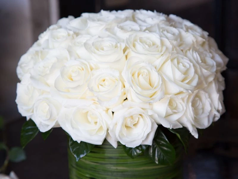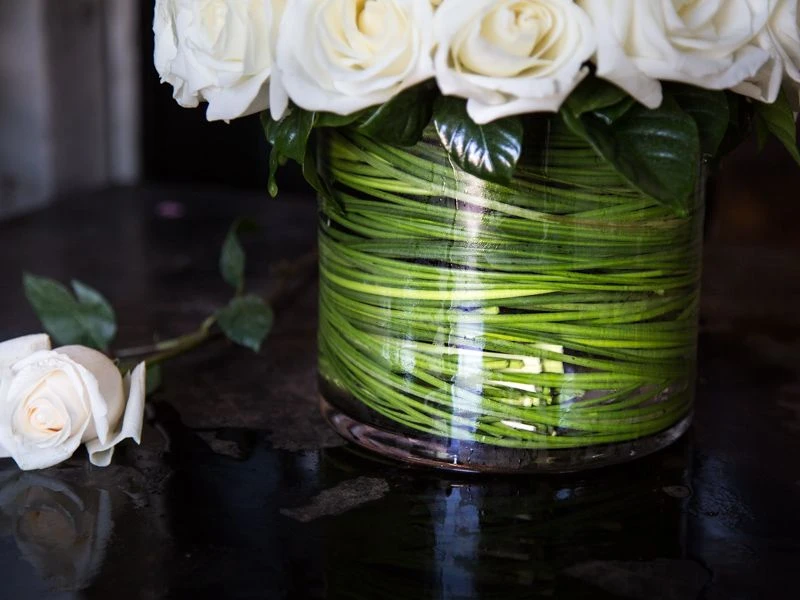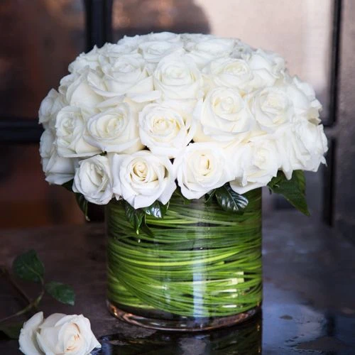 Up to fORTY FIVE Ivory white roses are gathered together, blooming in each direction. Vibrant green steel grass can be seen submerged, lining the interior of the 7” by 7” glass vase. Overall, this arrangement stands 13” tall and 12” wide.