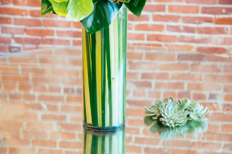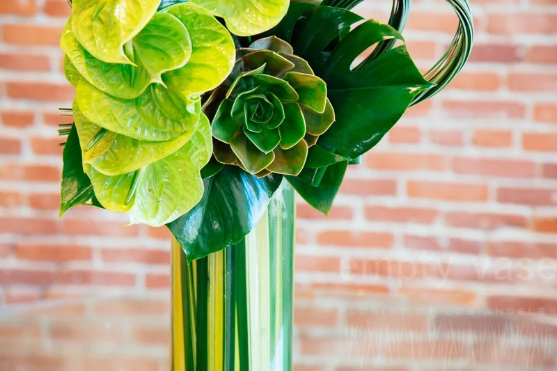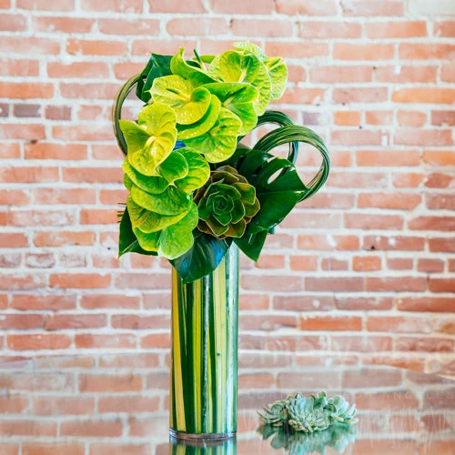This modern floral design offers the emerald perfection of green. A burst of Anthurium cascades to one side, with blooming succulents resting just beneath. Monstera leaves and steel grass are strategically placed behind as the backdrop to the blooms. Resting inside a 20” by 6” glass vase, flax and Ti leaves line the interior. This arrangement stands 34” tall and 15” wide overall.