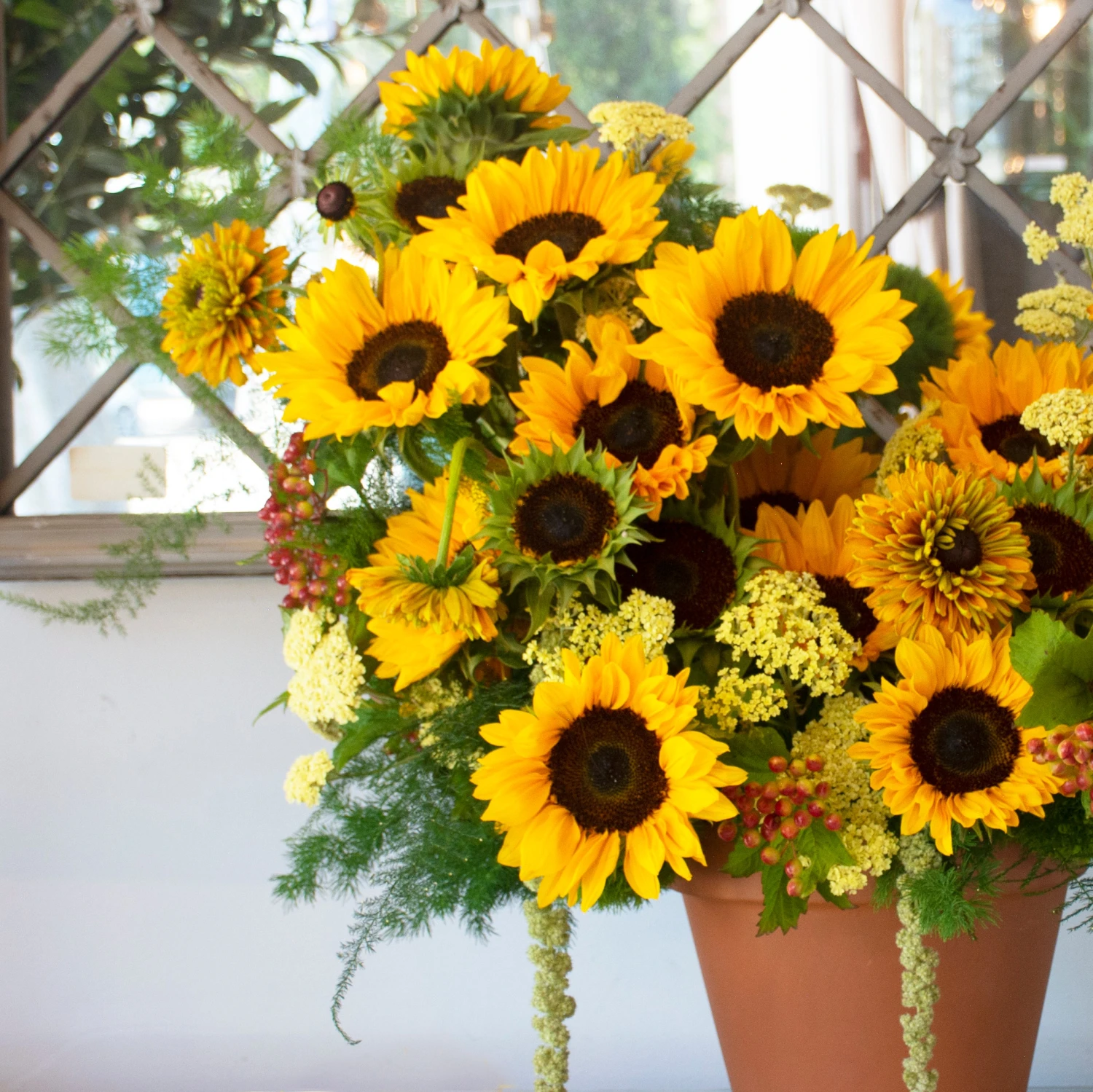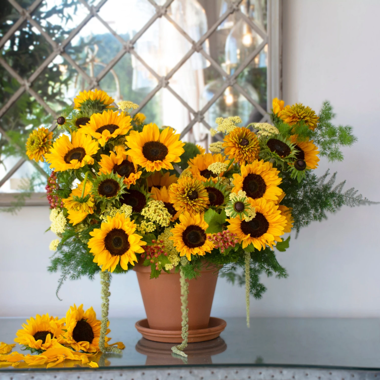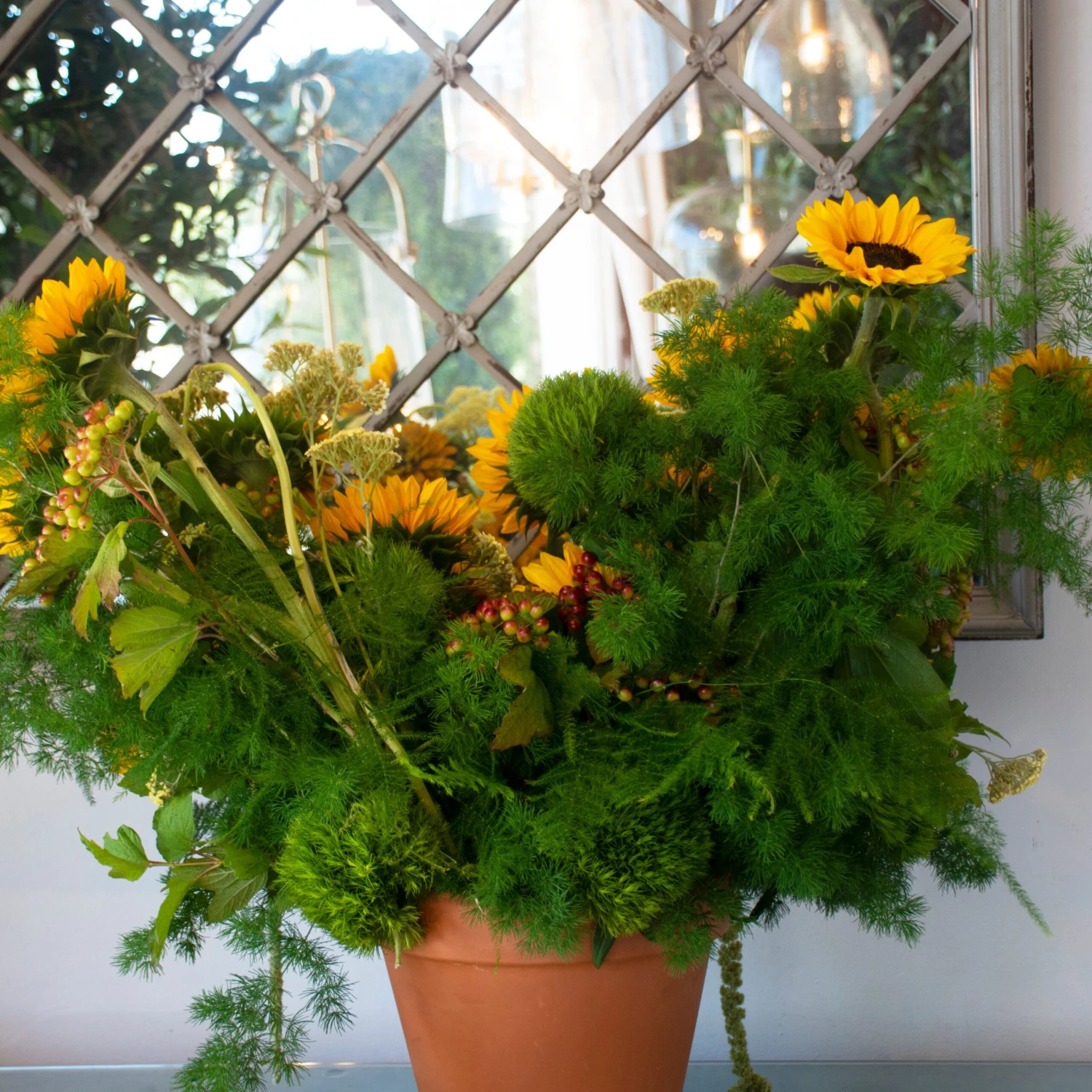 This beautiful floral design is reminiscent of a willow tree garden by a still lake during summer. Lush sunflowers and yellow yarrow plants are placed beside yellow zinnia and vibernum berries. Lush green Amaranthus rest beneath the blooms alongside fern. Resting inside a classic 10” tall orange ceramic garden pot, overall this arrangement stands around 20” tall and 24” wide overall.