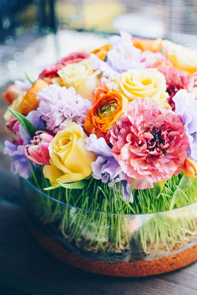 This spring, delight in a vibrant design reminiscent of your own personal countryside. Two-toned peach tulips rest alongside tangerine hued tulips, pink hyacinth, delicate orange ranunculus, raspberry hued italian ranunculus, and sunshine yellow roses. Lavender sweet peas provide a sweet contrast, all resting atop a bed of wheat grass to look as if it had been growing there all along. This radiant arrangement is offered in 2 sizes: Petit which rests within a 4″ by 10″ low cylinder vase, and grande which rests in a 4″x 12″ vase.