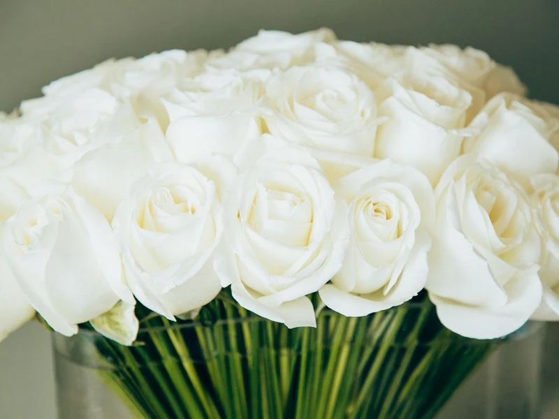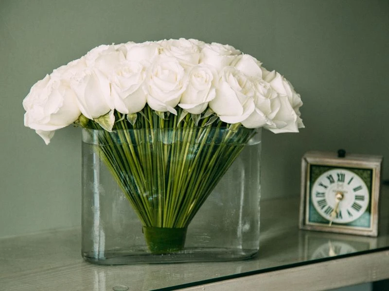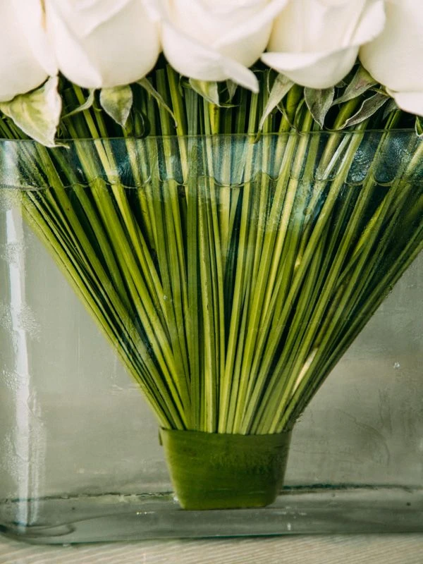 This beautiful floral design is as pure as clouds on a clear day. 25 Stunning white Tibetan roses bloom in every direction. Steel grass is gathered into the shape of a v and tied together with a single Ti leaf. Resting inside a 7” by 9” glass vase, and stands overall 12” tall and 14” wide.