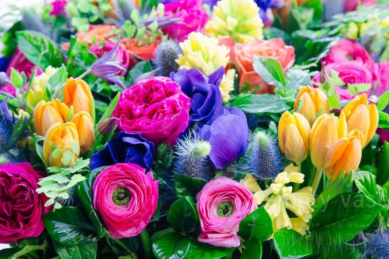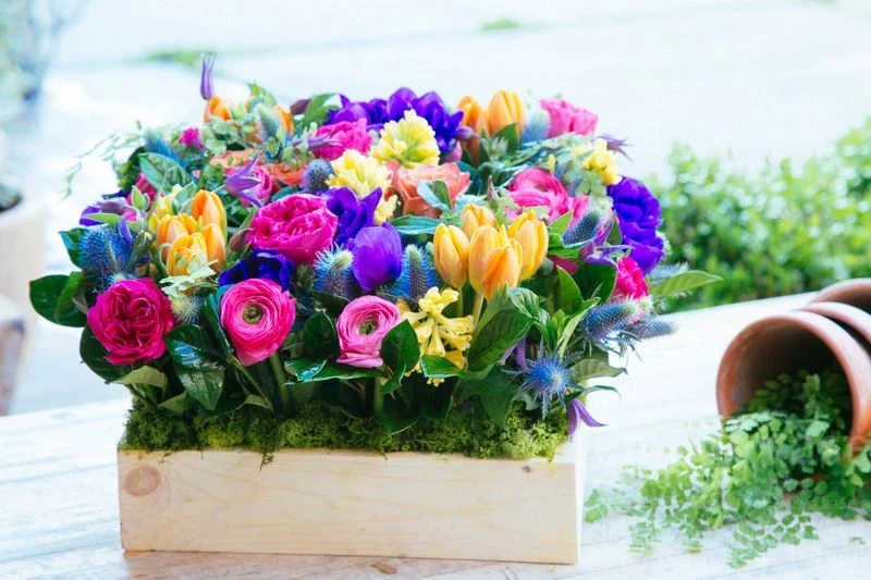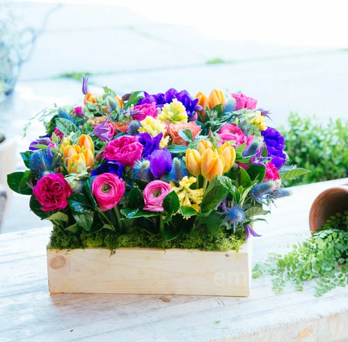 Take in the colors of the tropics in this vibrant and beautiful floral design. Garden roses and hot pink roses are paired with ranunculus and tulips. Exotic purple thistle and anemones are paired with clematis. Adding the tropic green hues, reindeer moss and gardenia leaves rest at the bottom. This arrangement sits inside a 12” by 12” wooden box, and stands overall 10” high.