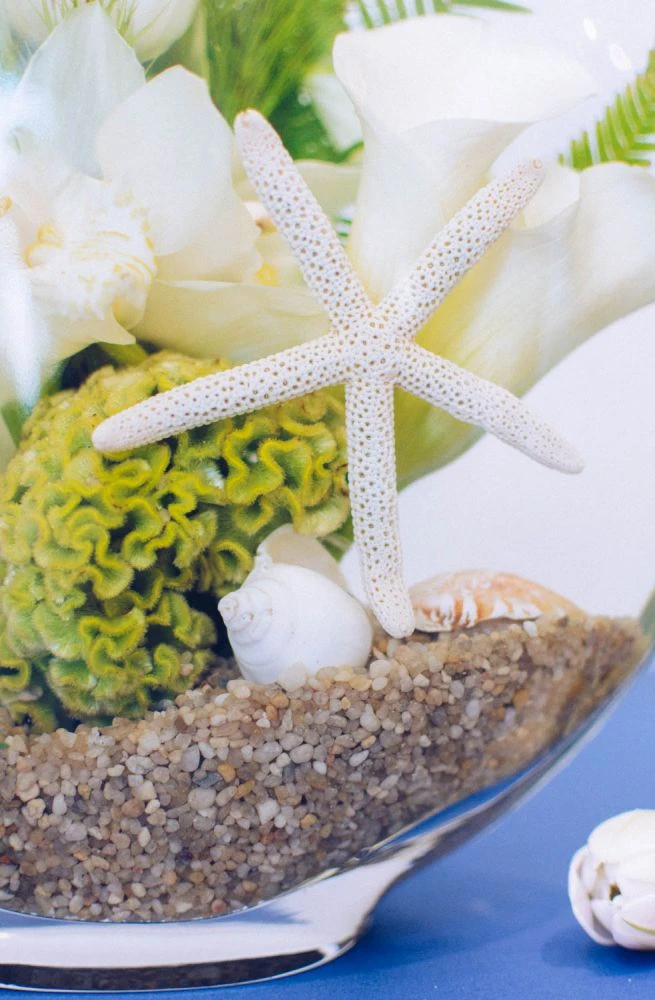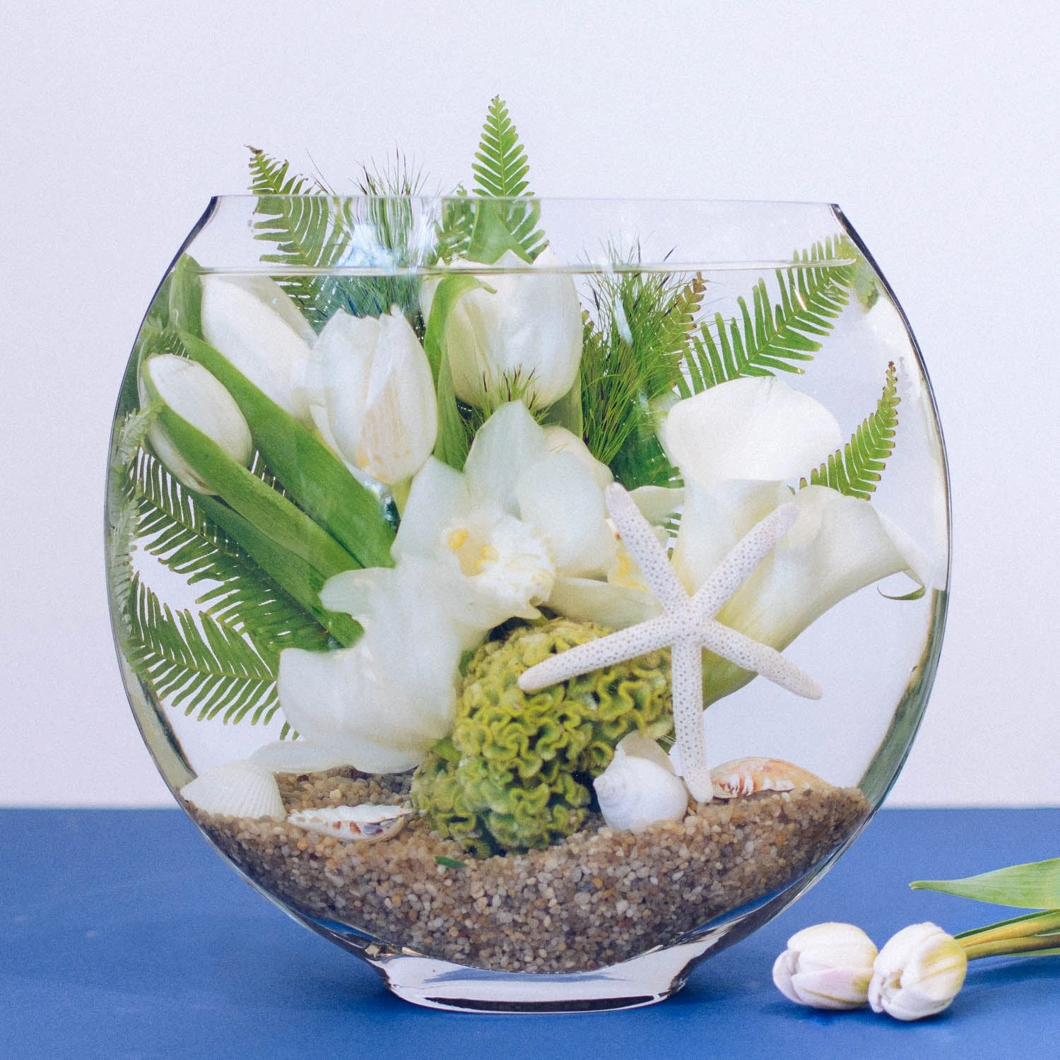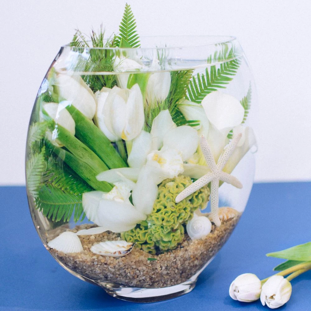 This unique underwater style design features crisp white tulips, calla lilies, and cymbidium blooms. Lime green coxcomb is added to provide the effect of a coral reef, all submerged within the 10″ tall by 11″ wide glass moon shaped vase with an opening of 8″ long and 4″ wide.