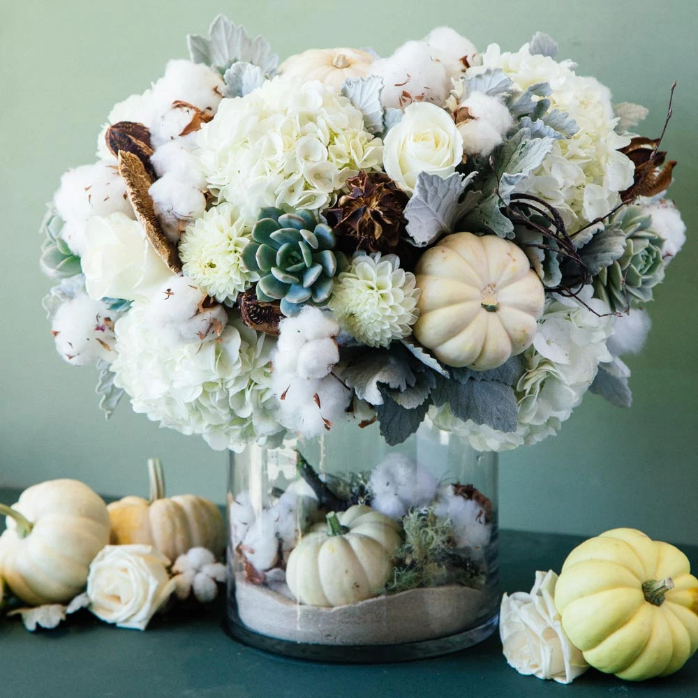 This incredible seasonal arrangement is sure to remind you that winter is coming. White roses and hydrangea contrast the lush dusty miller placed throughout. Small dried mushroom and cotton flowers can be seen between mini white pumpkins and succulents. Mahogany ties everything together, while small pumpkins can be seen resting within. Resting inside an 8” by 8” glass vase, overall this arrangement stands 17” tall and 19” wide.
