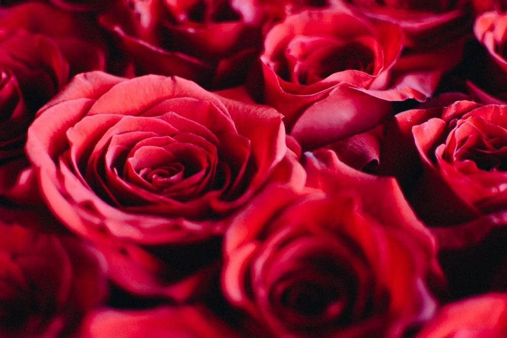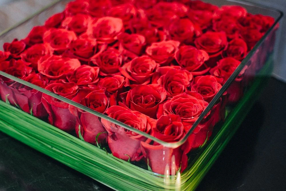 “The greatest thing you’ll ever learn is just to love and be loved in return.” 50 crimson red roses rest gracefully, wrapped in perfectly contrasting green steel grass. This breathtaking design rests within a 12″ by 12″ square glass vase.
