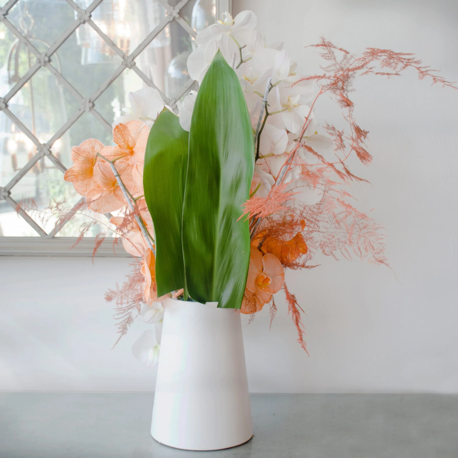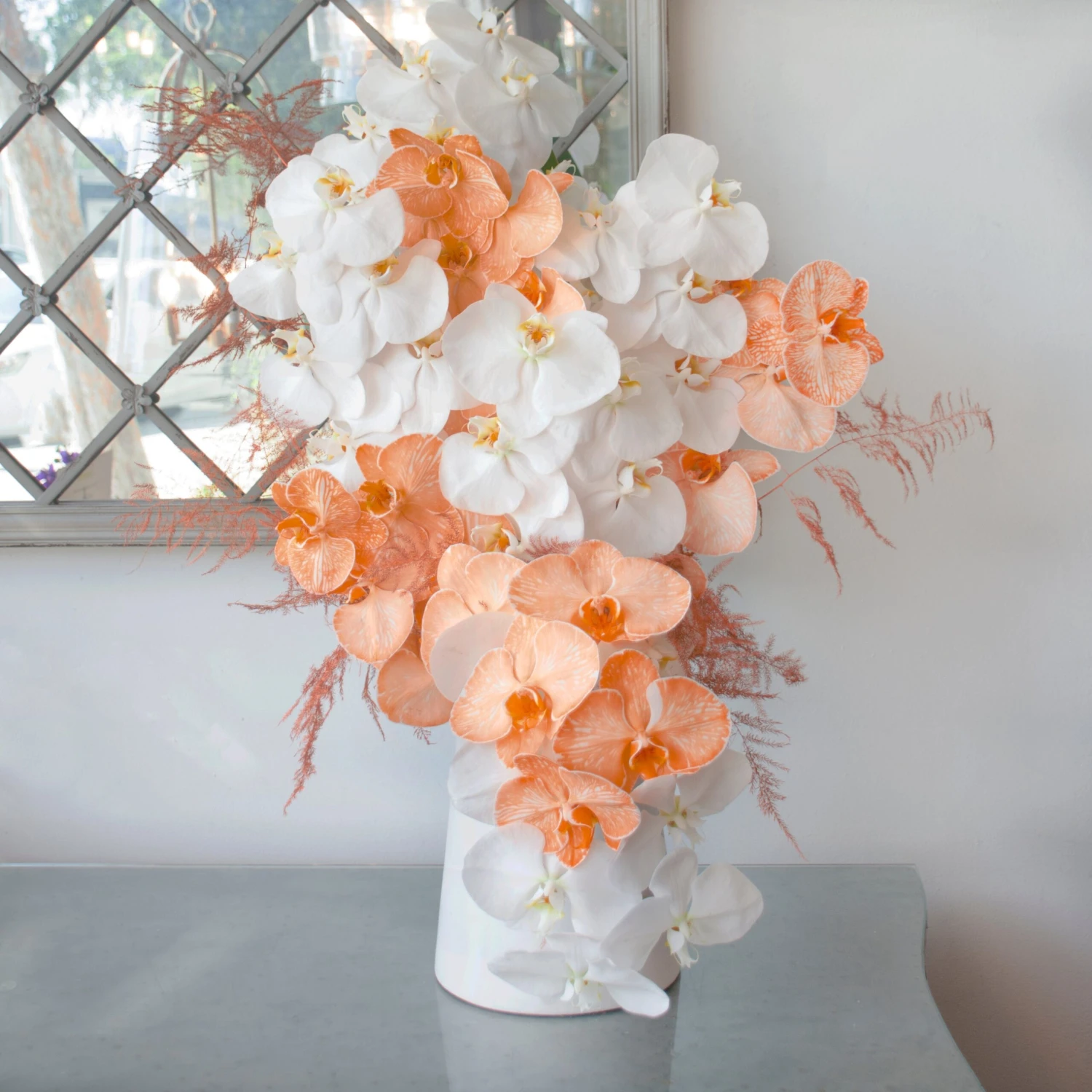 An exquisite floral arrangement that captures the essence of a sunlit orchard in full bloom. In a sleek, pristine white cylinder vase, delicate white and vibrant orange orchids gracefully intertwine, creating a harmonious blend of colors that exudes elegance and charm. The light touch of orange plumosa delicately accents this botanical masterpiece, as if a gentle breeze carries a hint of sweet citrus through an orchard in the golden hour. Perfect gift to brighten someone’s day or to adorn your own space with a refreshing burst of color and a dash of serenity. This arrangement sits at an impressive 34″ height.Â