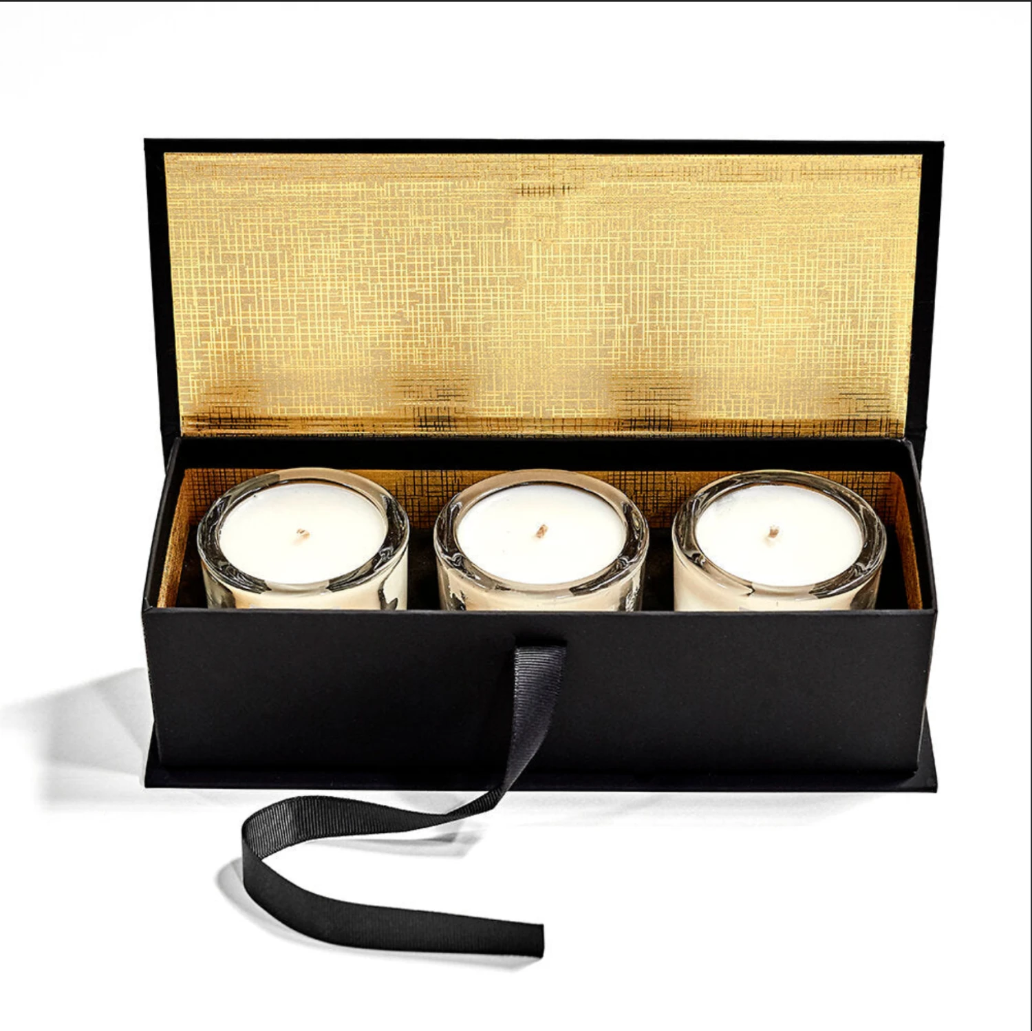 A trio of exquisite seasonally inspired organic luxury votive candles inside a black grosgrain ribbon tied and gold paper lined gift box.