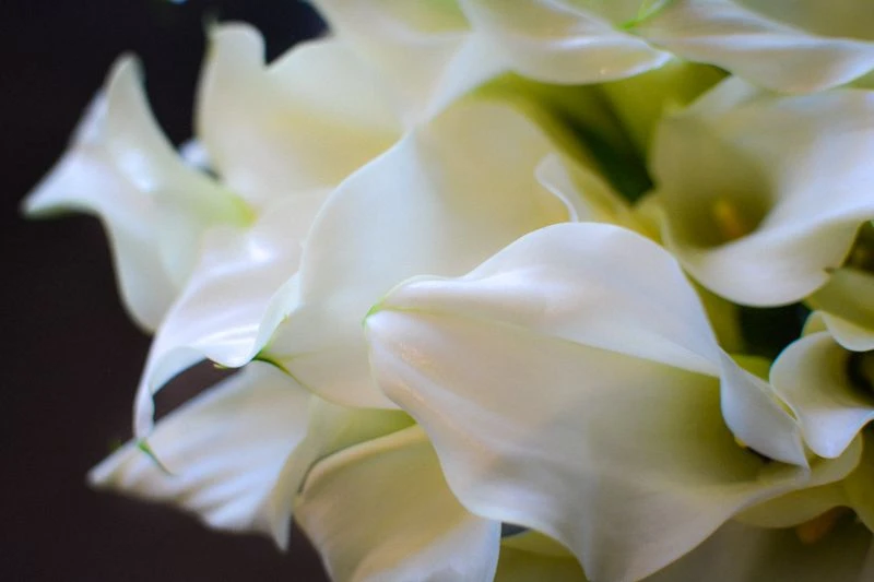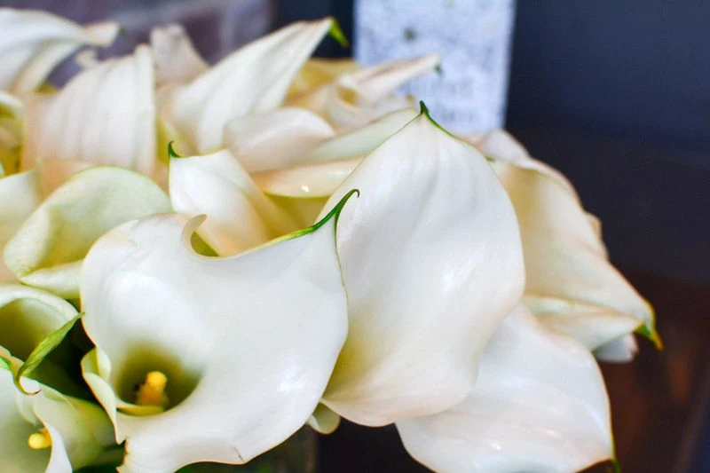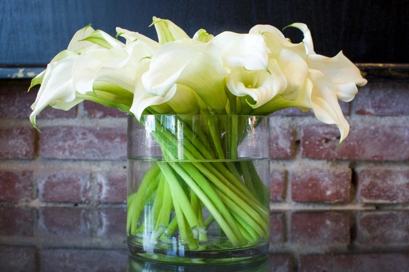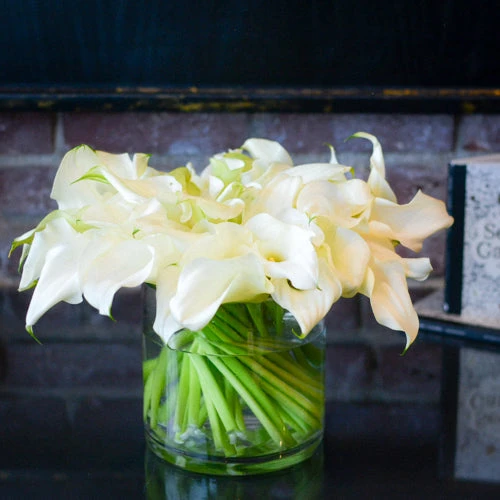 This modern design will provide a touch of elegance to any room. 30 white calla lilies are artfully placed as if dancing in perfect harmony. This arrangement rests within a 5” by 5”glass vase, and stands at 7″ tall.