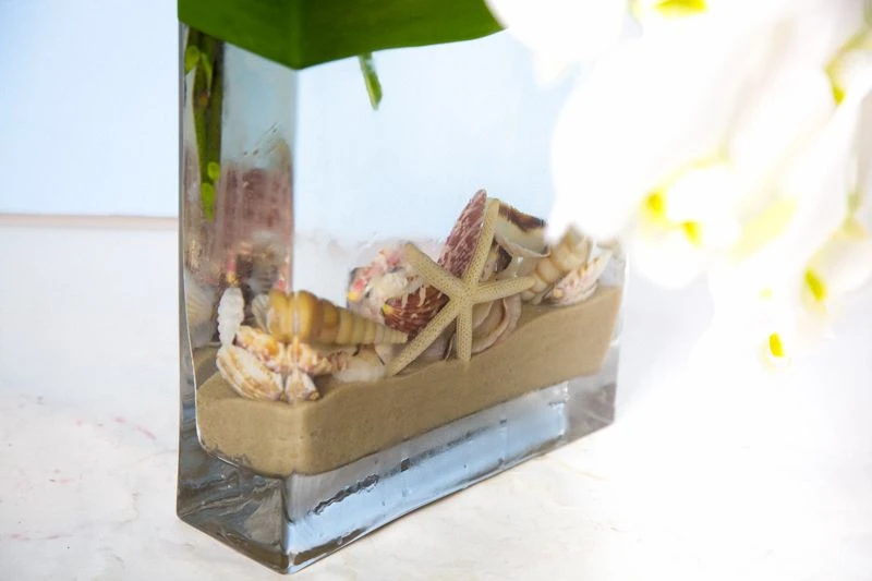This luxurious arrangement boasts modernity and a timeless beauty. Stunning white phalaenopsis orchids cascade over the vase, with monstera leaves and a succulent resting behind the blooms. Resting at the base of the 13” by 8” vase, brown sand and seashells rest at the bottom. Overall this arrangement stands 16” tall and 17” wide.